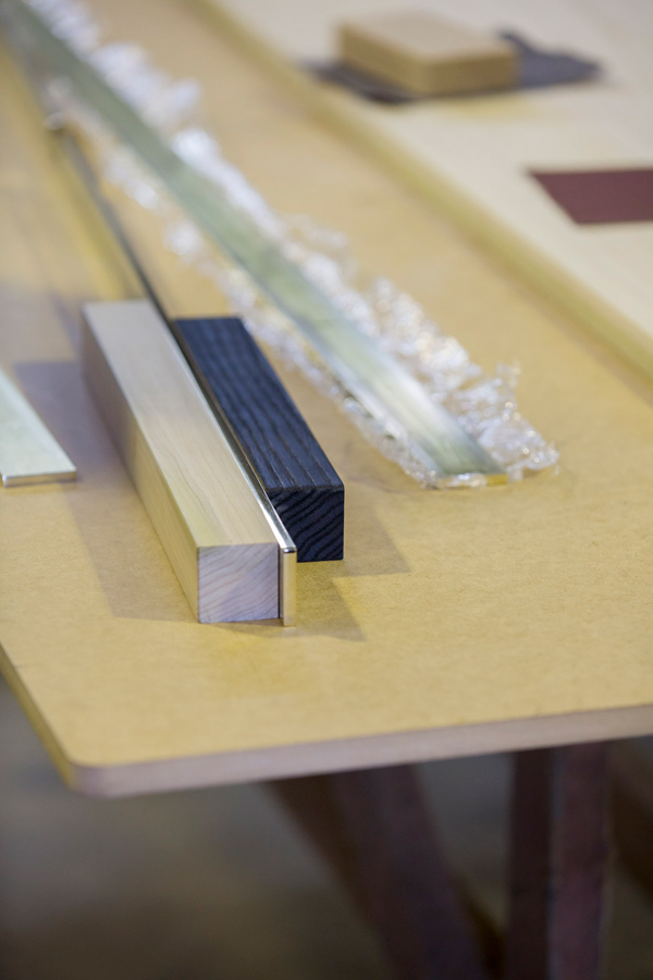 Stripped explores the inherent textural and tactile characteristics of Tulipwood and Red Oak. Employing a wire brushing technique to expose the grain of the Red Oak, the lumber is then charred and blackened through a process of controlled torching. Offering a brilliant contrast the smoothness of the Tulipwood is accentuated with white dust giving the timber a milkiness to touch.