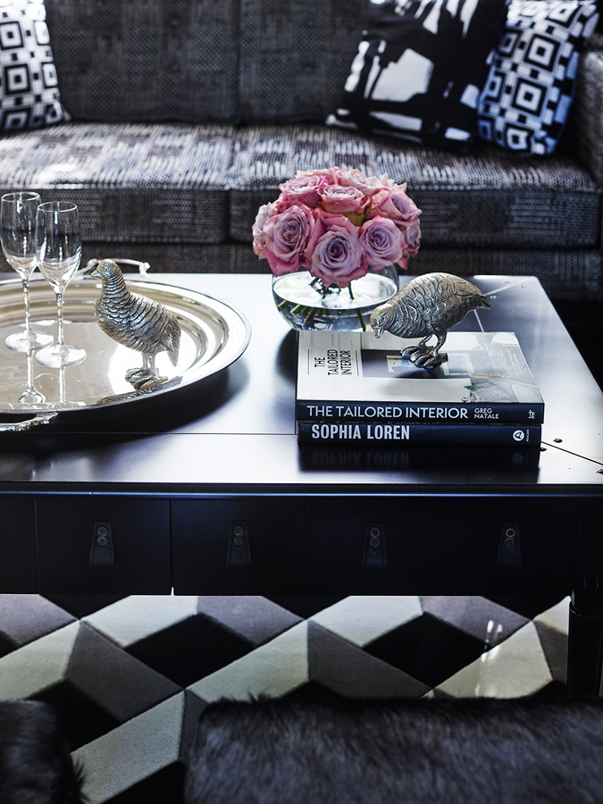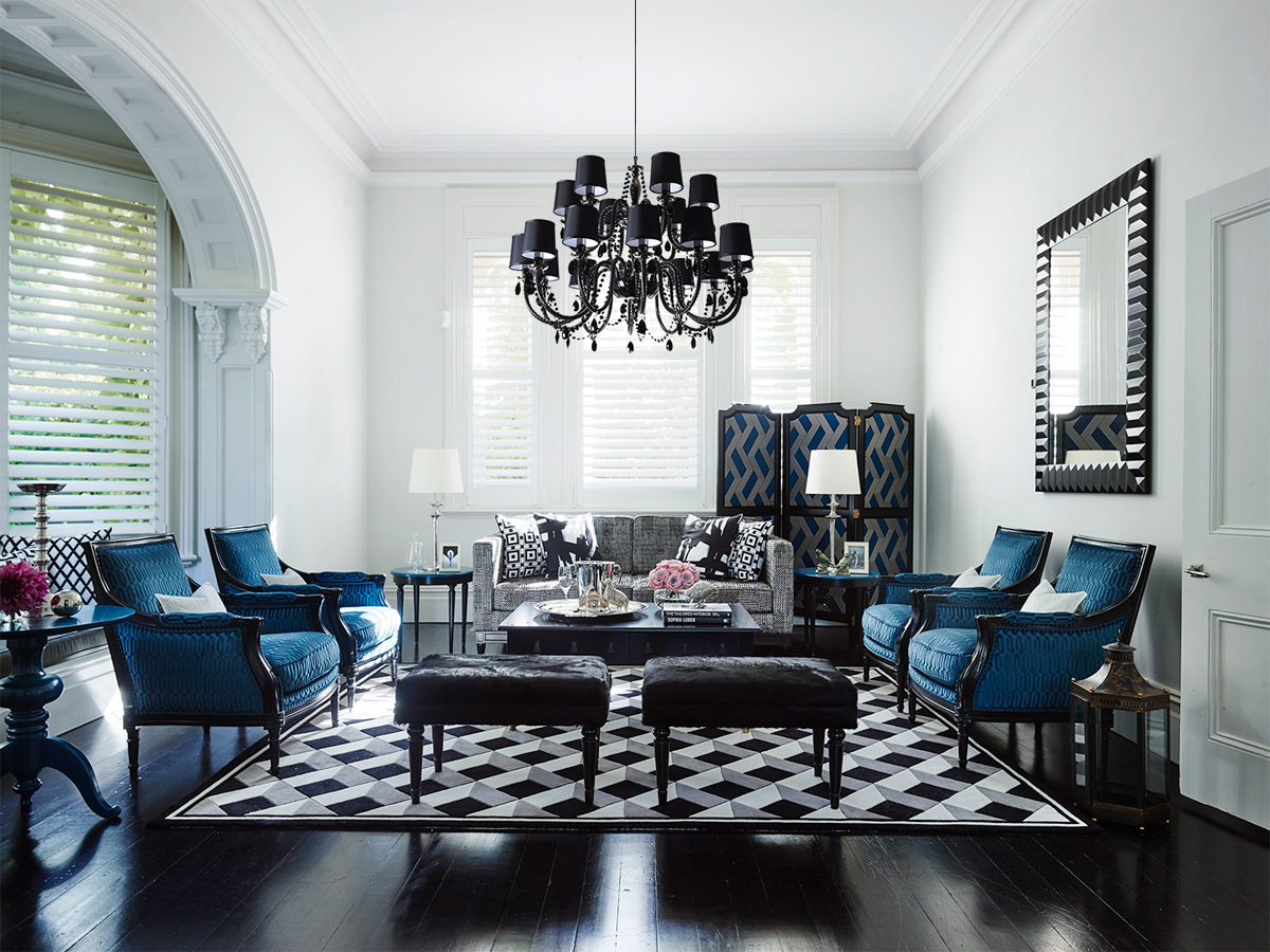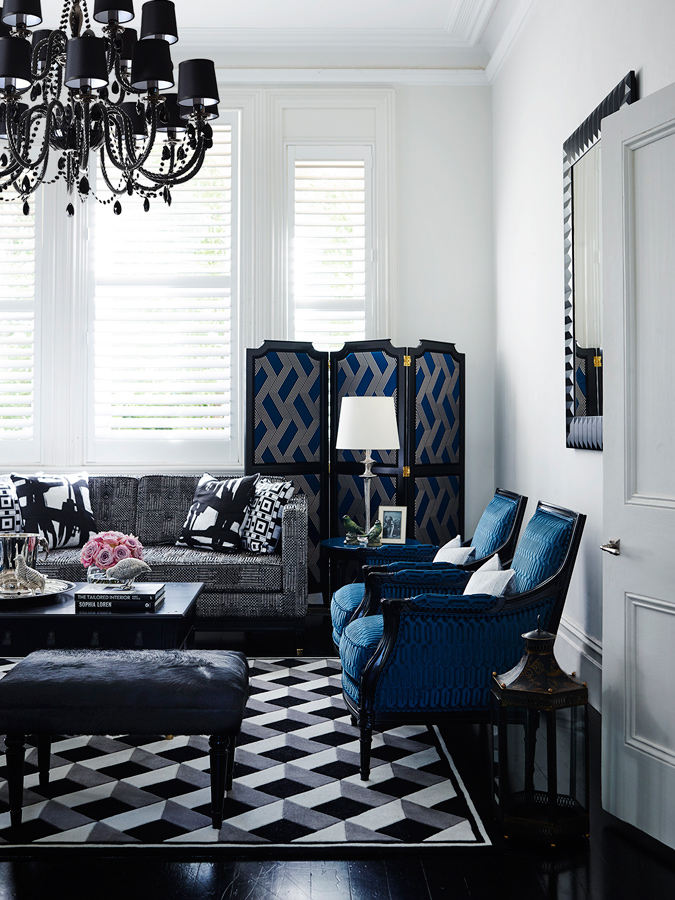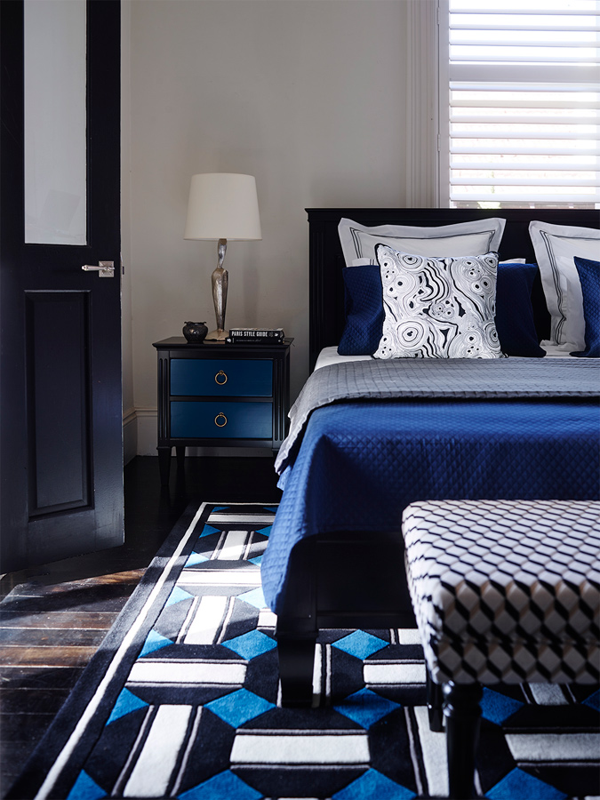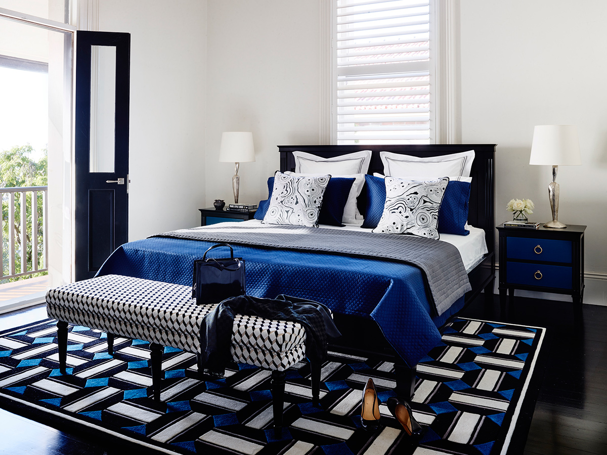 Bold, geometric prints in black, white and brilliant blues - the New Zealand wool rugs serve as perfect accompaniments to the bespoke Grange X Greg Natale pieces.