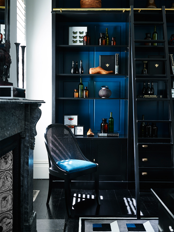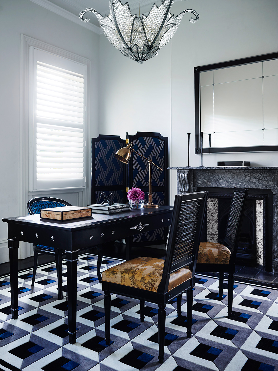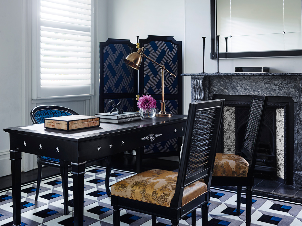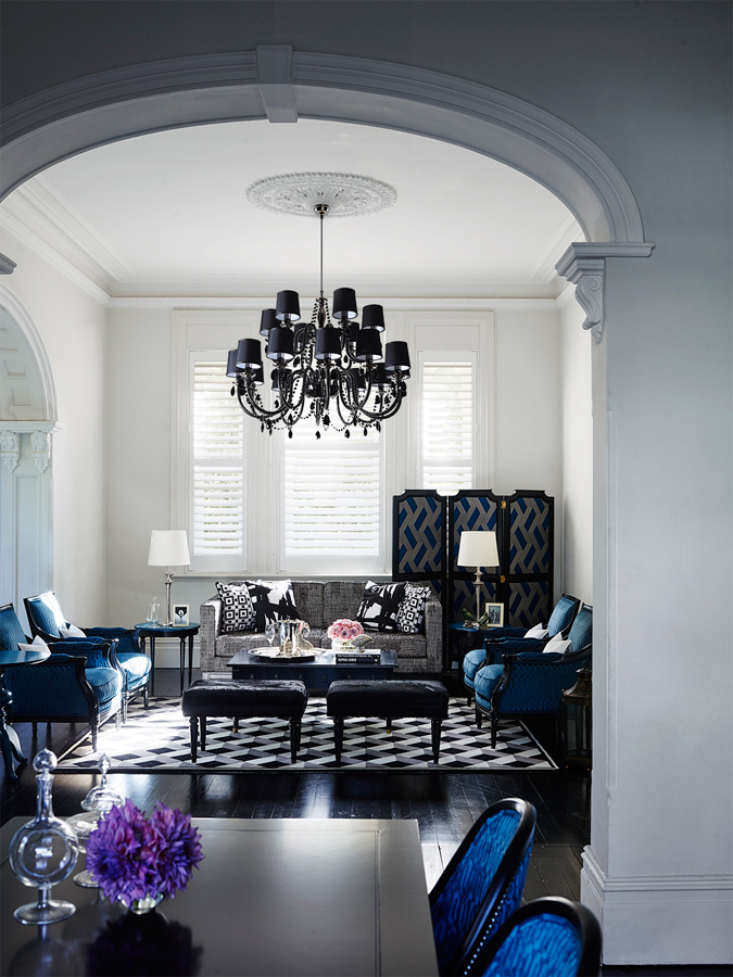 Bold, geometric prints in black, white and brilliant blues - the New Zealand wool rugs serve as perfect accompaniments to the bespoke Grange X Greg Natale pieces.
