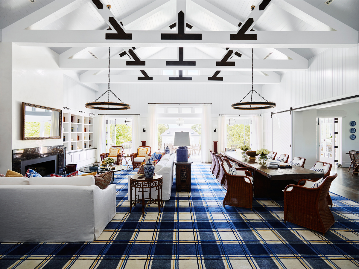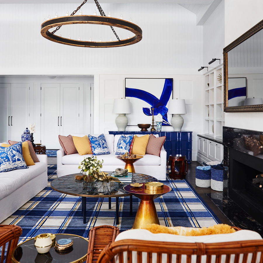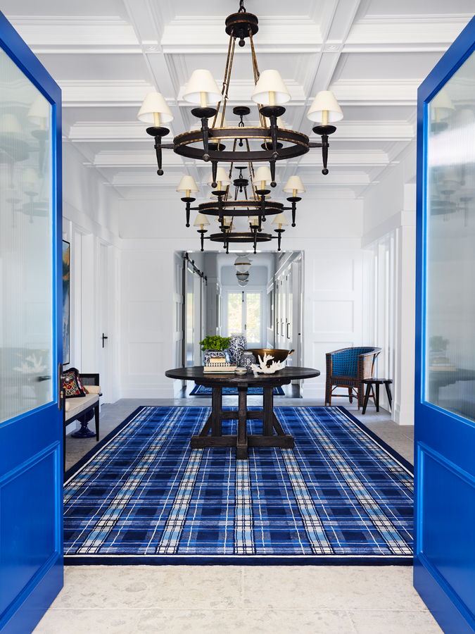 White was an obvious choice to create a light, clean backdrop and highlight the house’s generous proportions, while paneling gives the white ceilings and walls dramatic detail. Blue was the perfect partner to ensure a sophisticated seaside vibe, we opted for a vibrant cobalt, beginning with standout double front doors and continuing in a series of patterned rugs, runners and tiles.