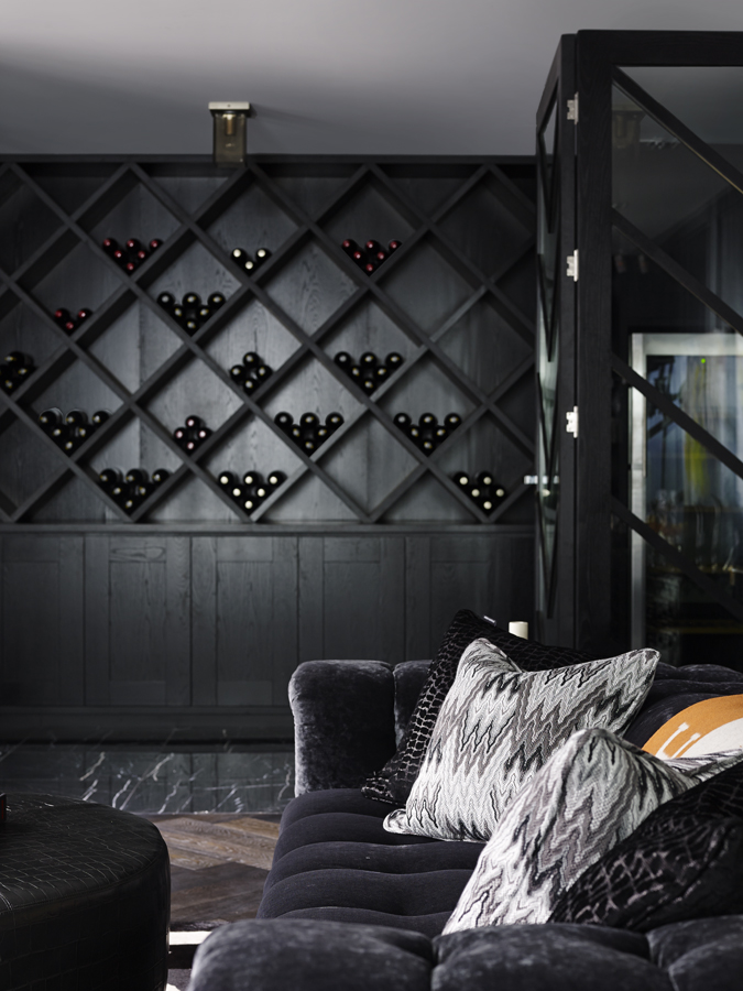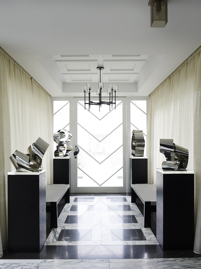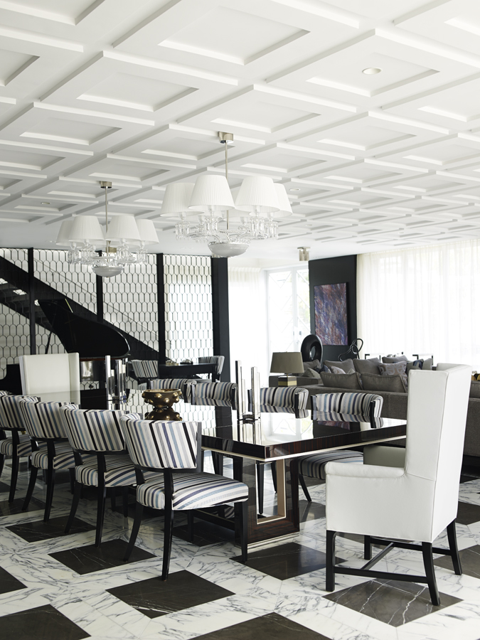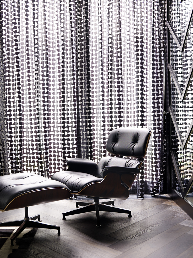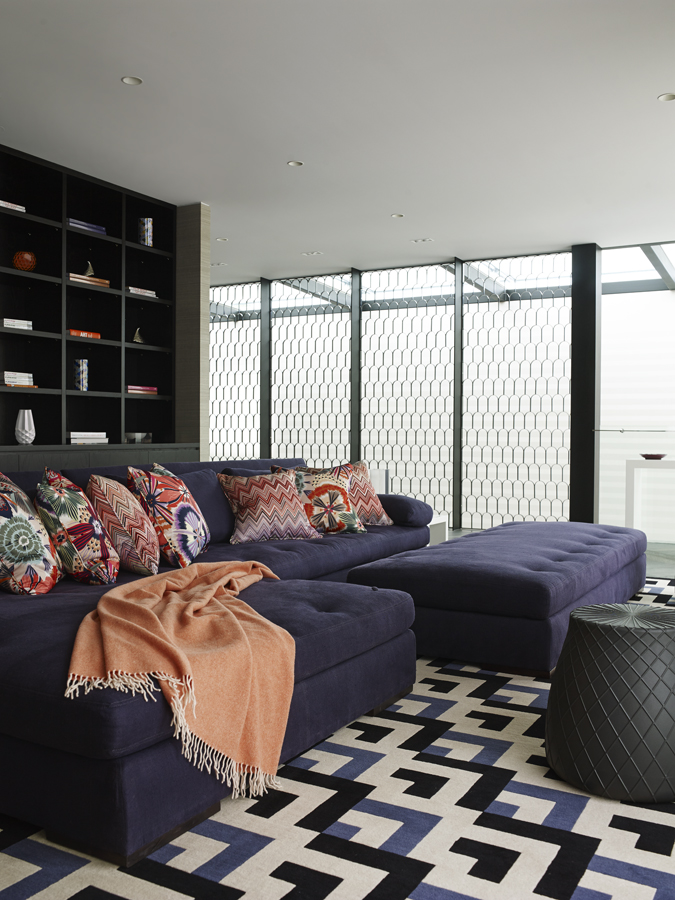 Inspired by the angled roofs, chevron, diagonal and geometrics feature throughout, in window treatments, floors and panels on ceilings and cabinetry. A three-level metal screen makes a striking vertical statement, while the house's sizeable proportions allow for large and plentiful pieces of furniture.