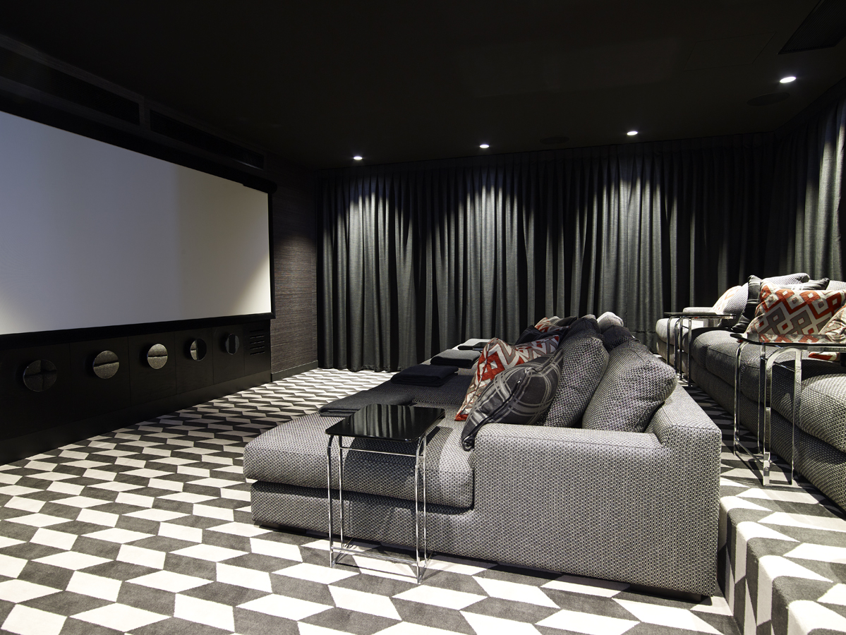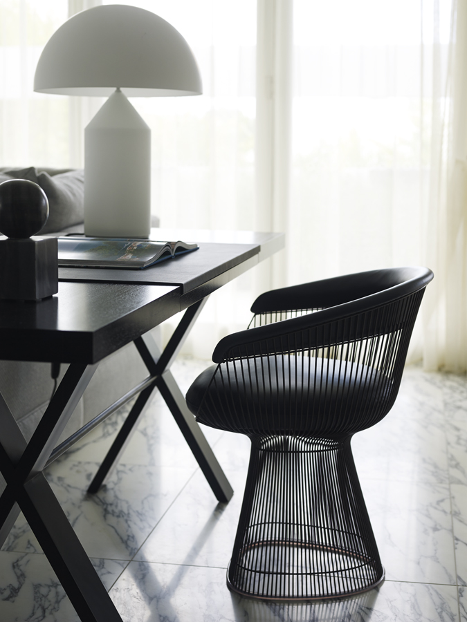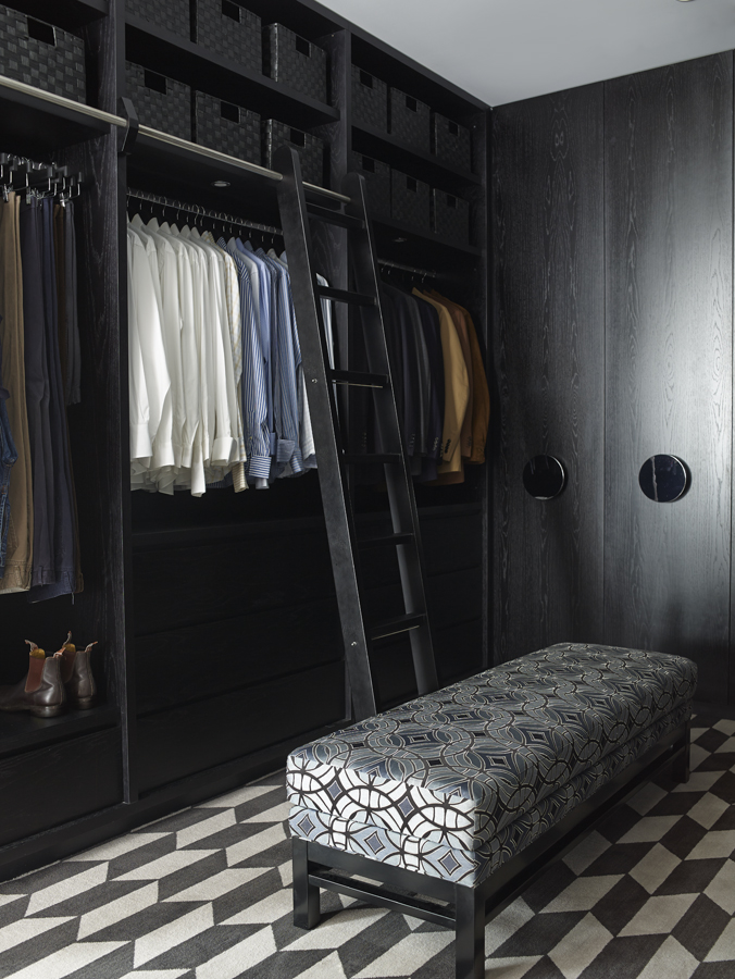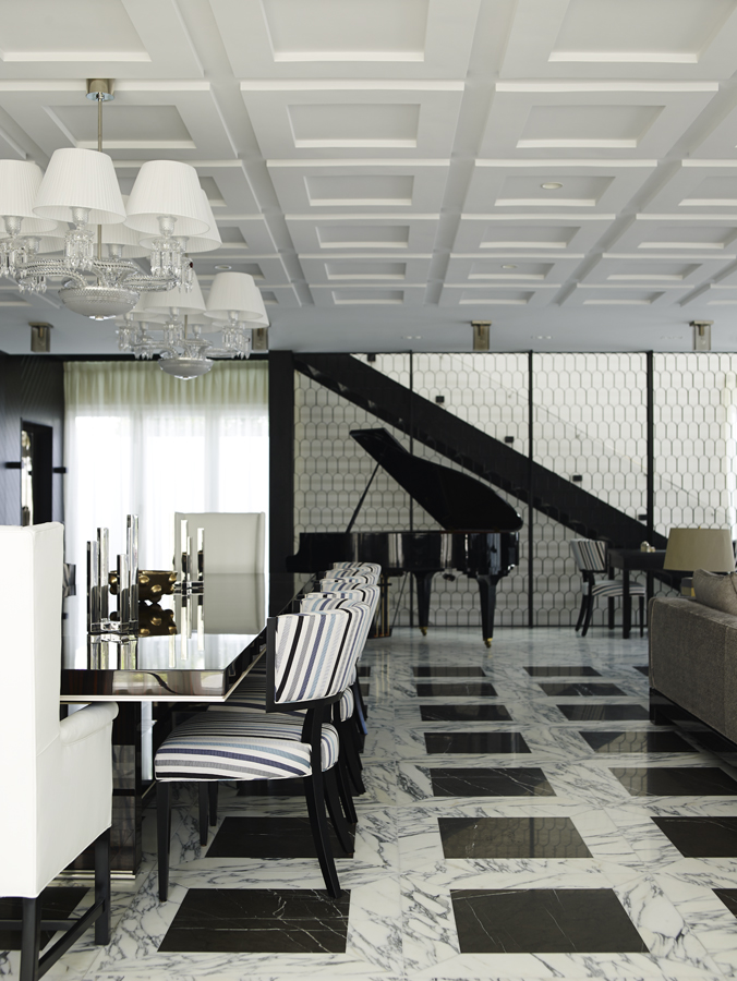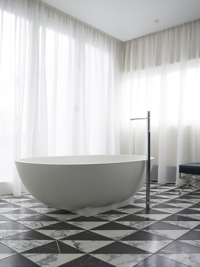 Inspired by the angled roofs, chevron, diagonal and geometrics feature throughout, in window treatments, floors and panels on ceilings and cabinetry. A three-level metal screen makes a striking vertical statement, while the house's sizeable proportions allow for large and plentiful pieces of furniture.