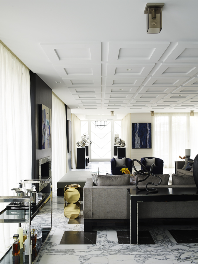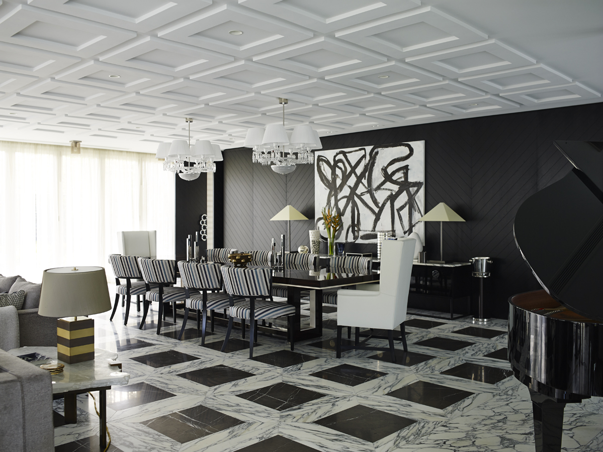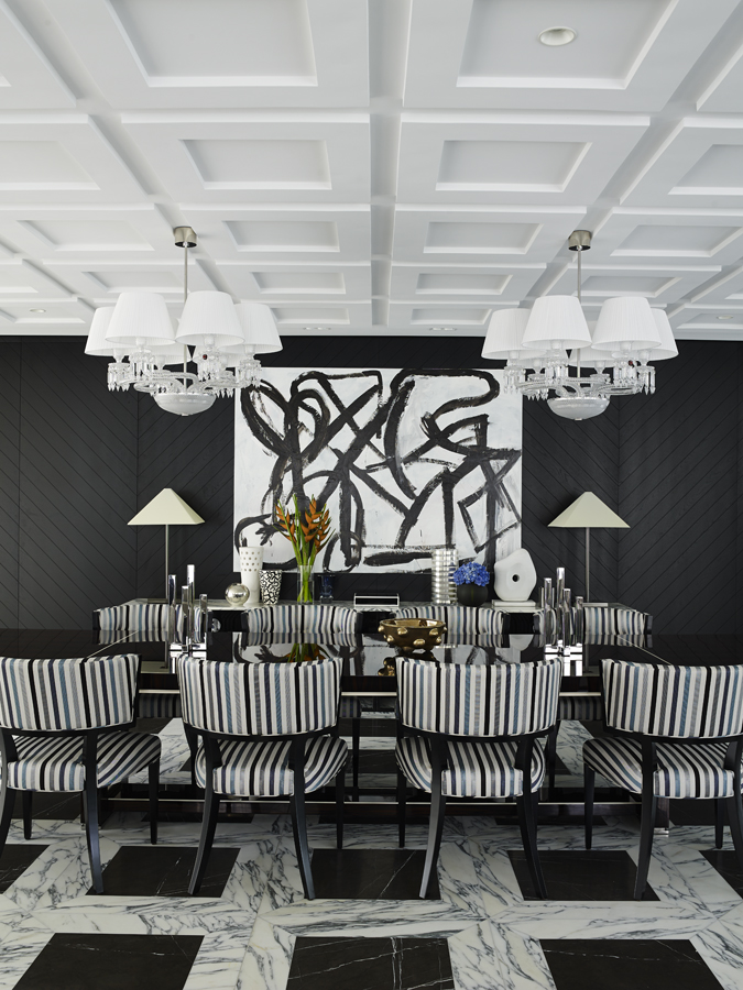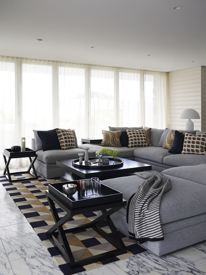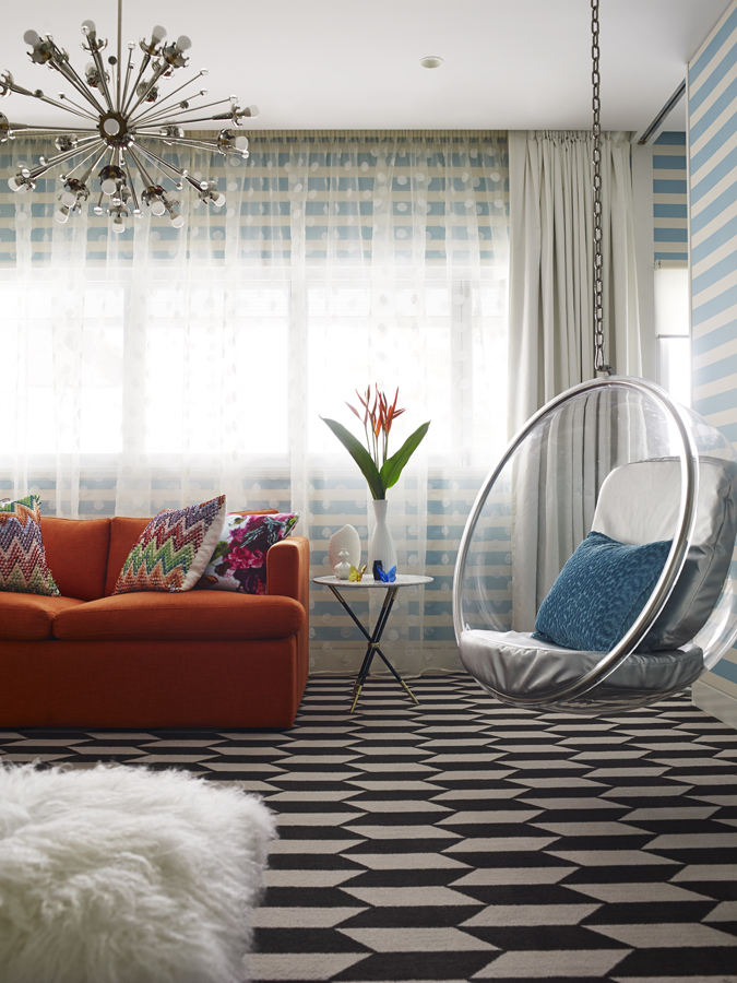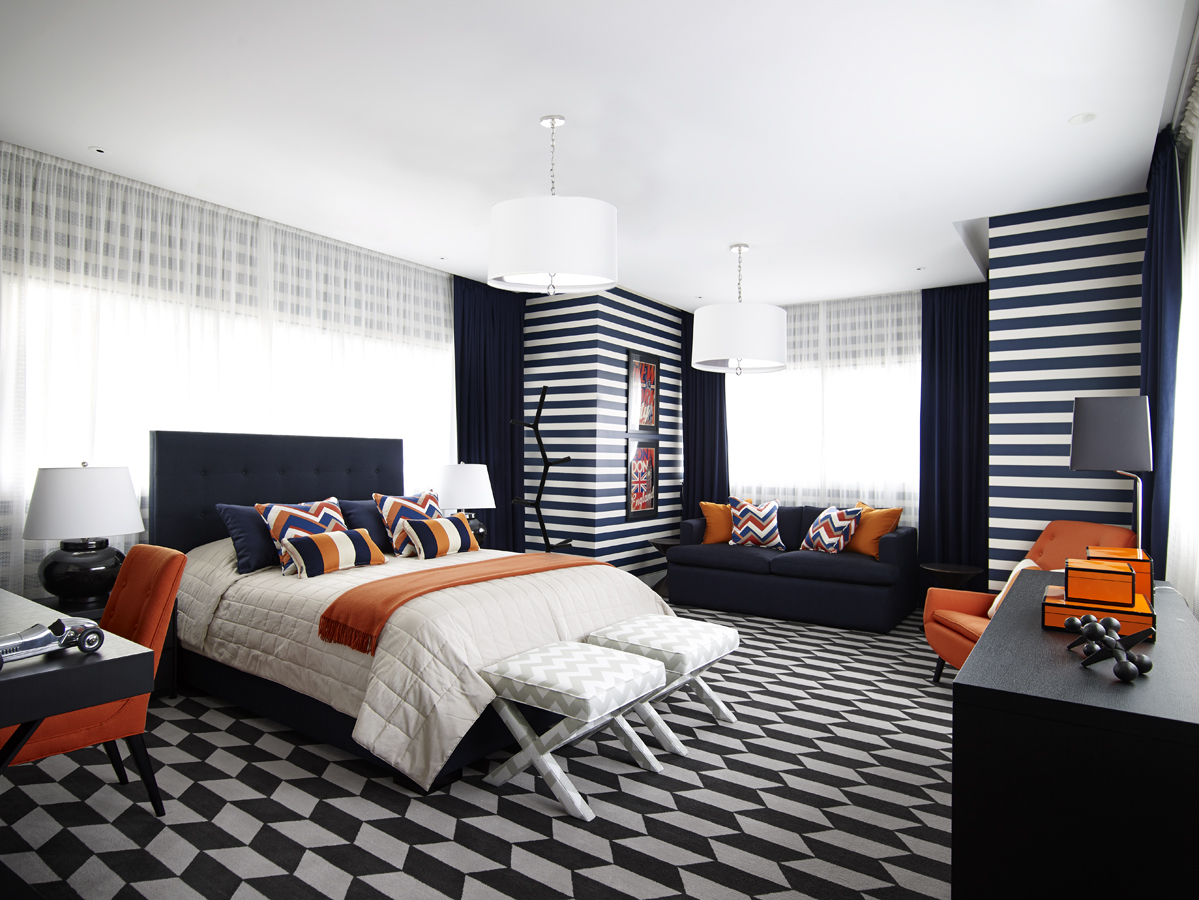 Layered on the monochromes are navy and taupe, with pops of orange adding energy to this modern deco masterpiece.