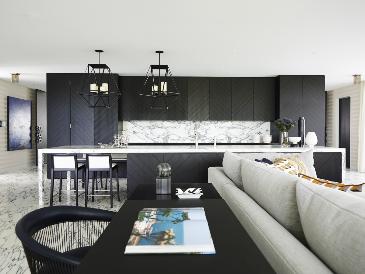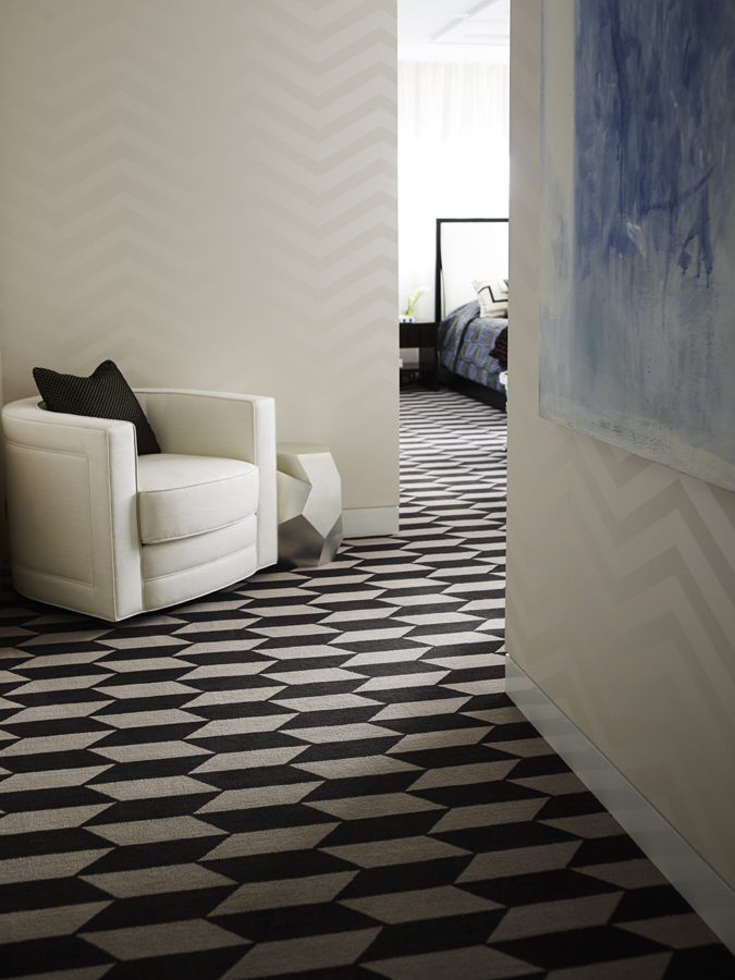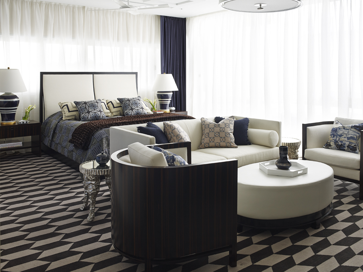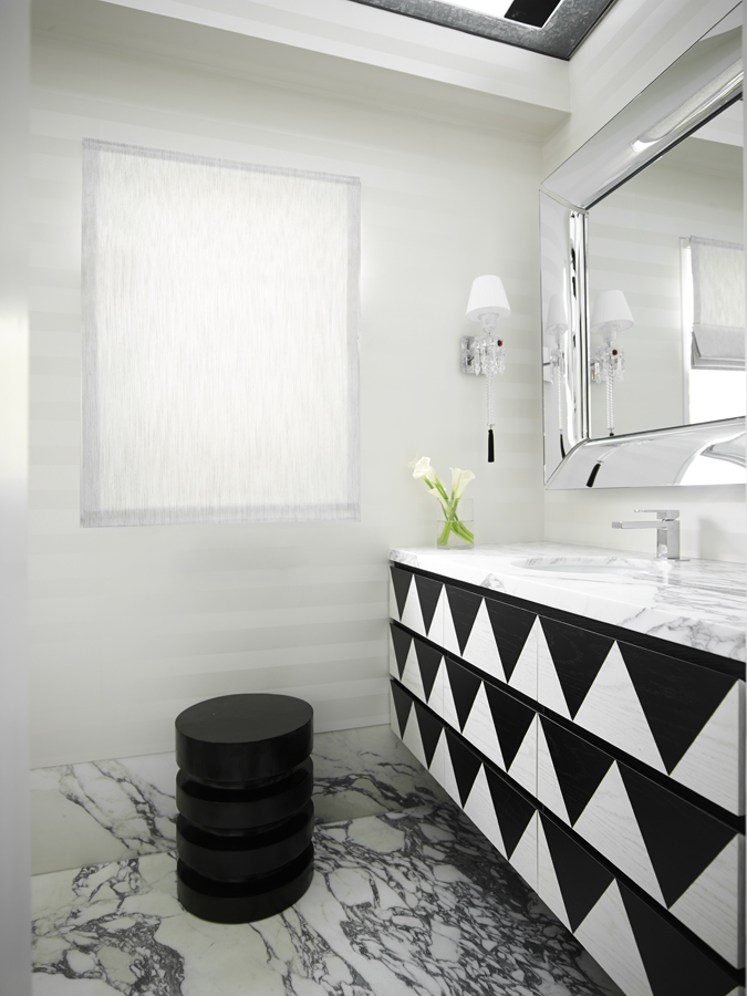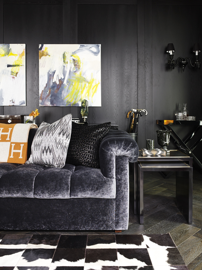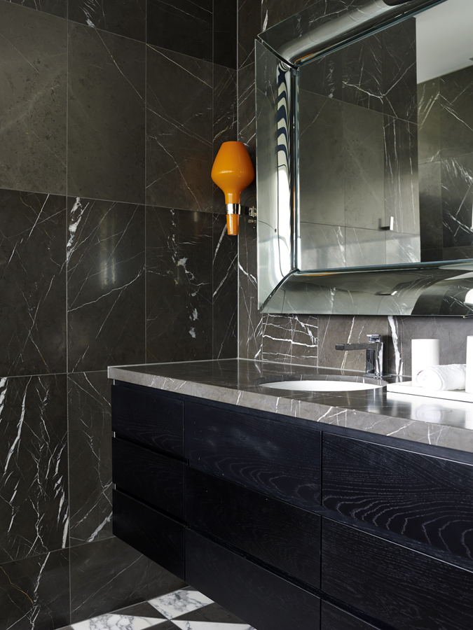 Layered on the monochromes are navy and taupe, with pops of orange adding energy to this modern deco masterpiece.