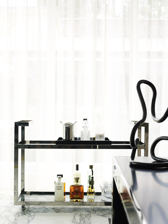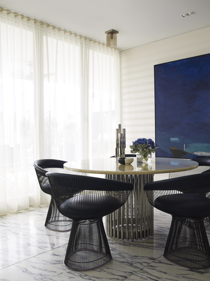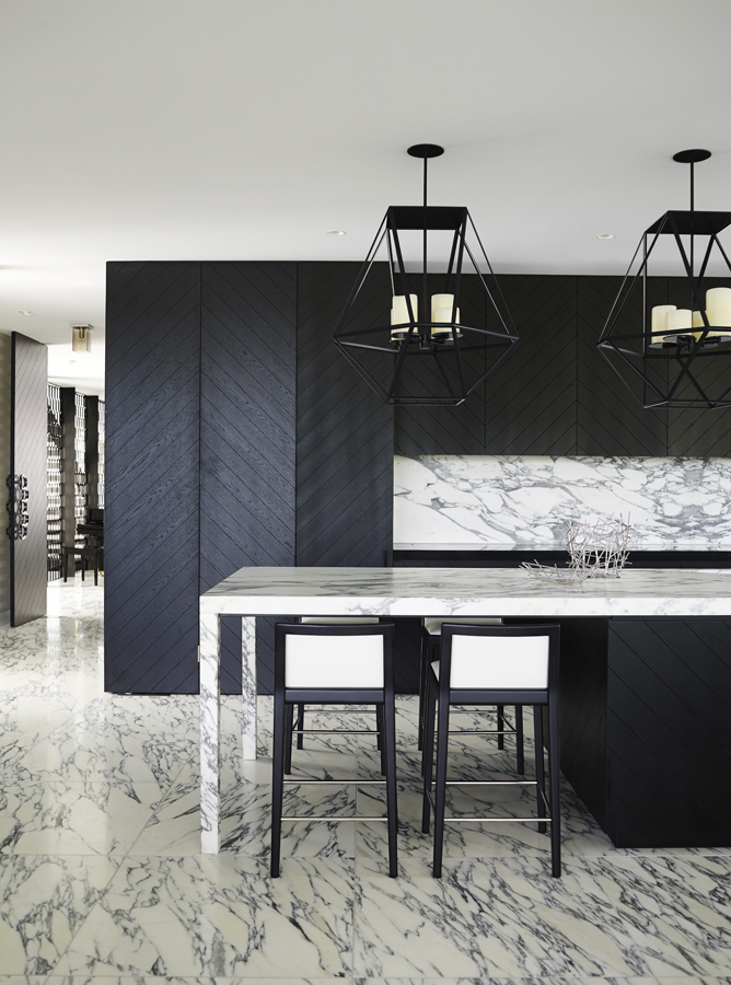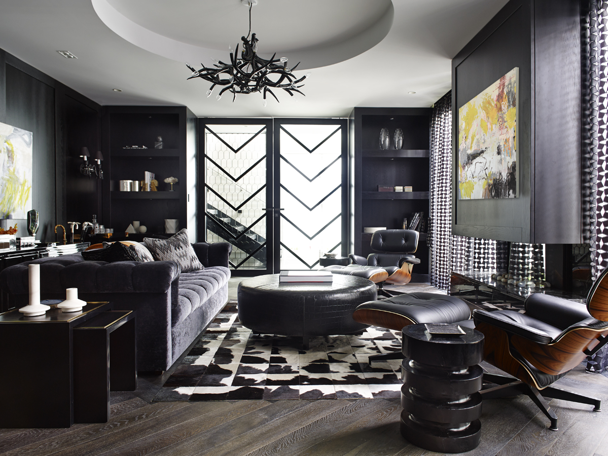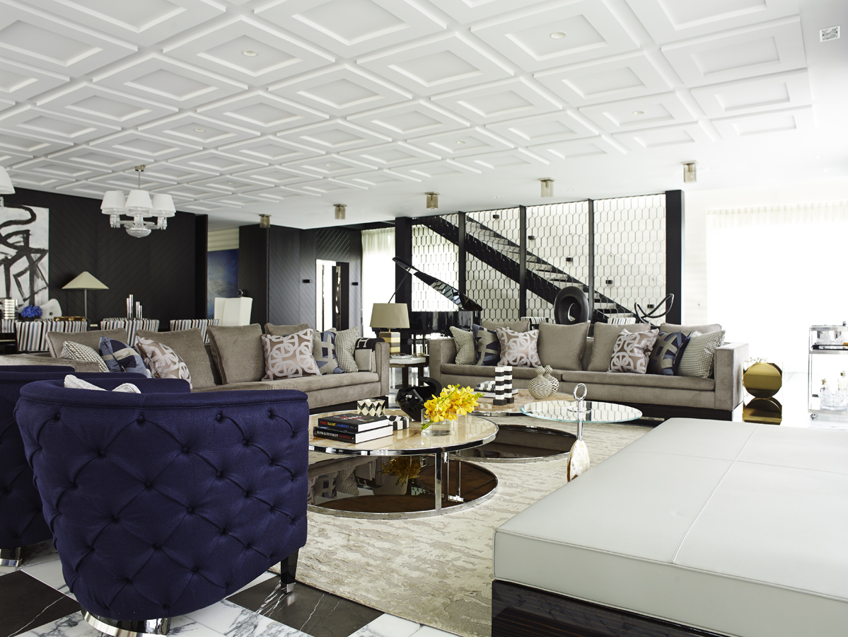Layered on the monochromes are navy and taupe, with pops of orange adding energy to this modern deco masterpiece.