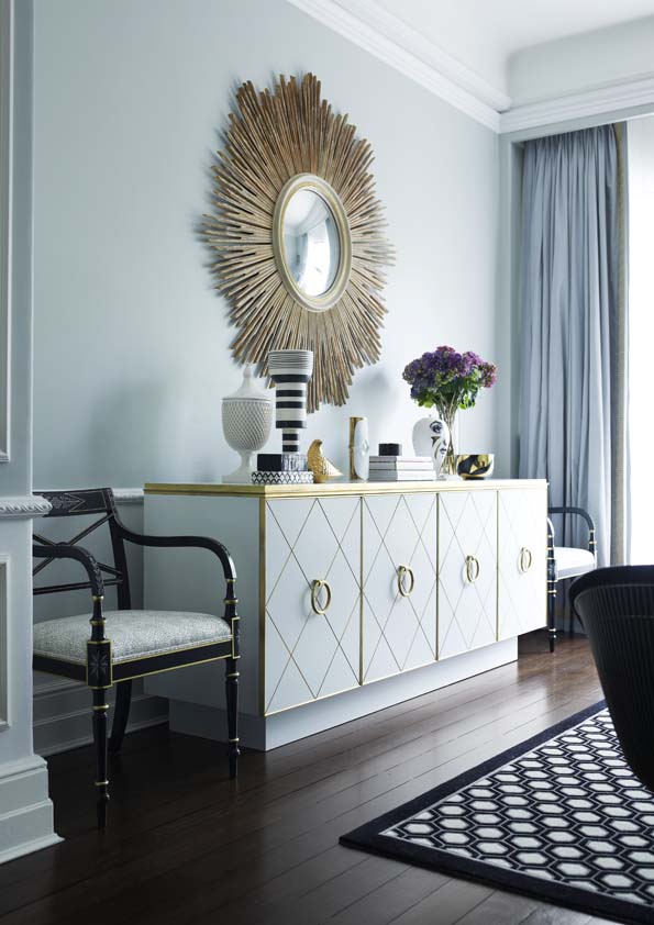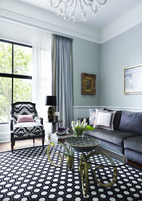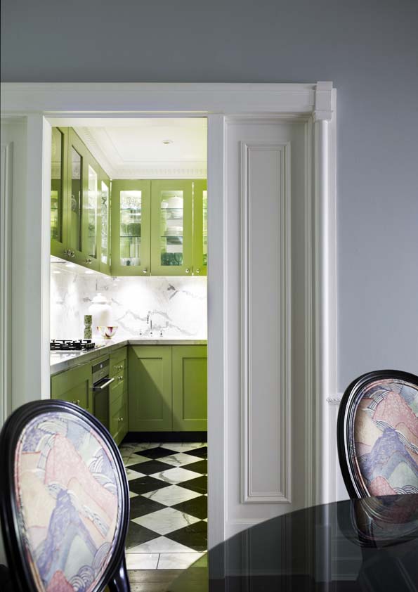 Monochromes anchor the design, providing a strong note against dove-grey walls, with key colours defining different spaces, such as vivid blues in the dining room and green in the hand-painted kitchen. Mid-century ceramics and modern furniture continue to blend old and new, while gilt touches add glamour.