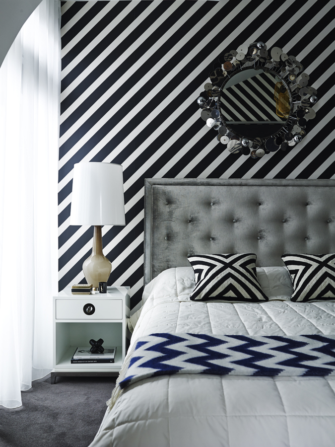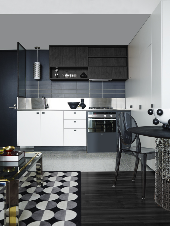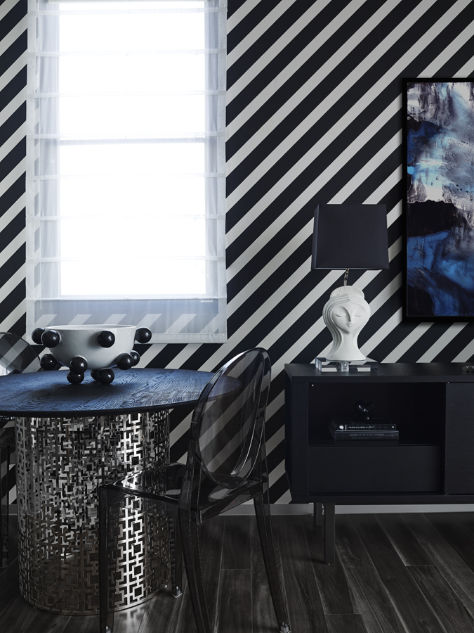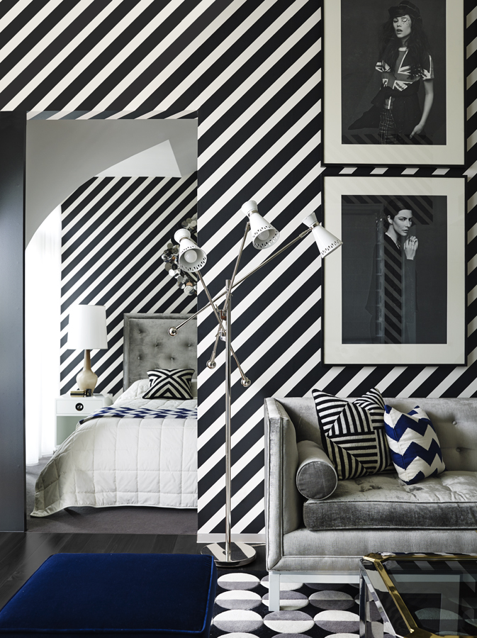 Against the black and white palette, washes of grey and the occasional punch of vivid blue ensure the effect is bold and cohesive without appearing crowded.