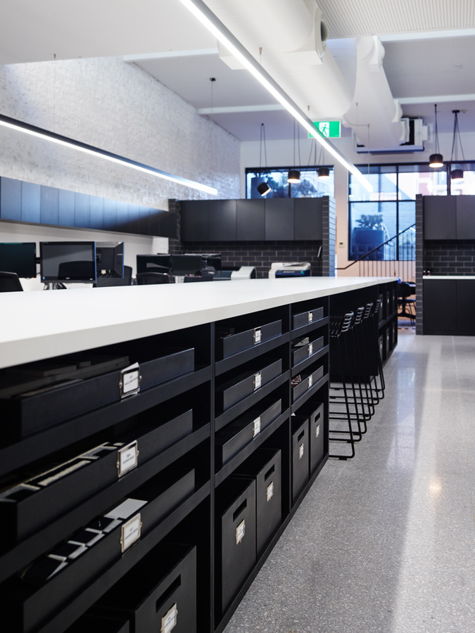 Embracing the complex combination of roles of architect, builder, interior designer and client, Greg Natale embarked on the detailed renovation of a building in Sydney’s Surry Hills for the practice's brand new headquarters. The existing 1960's building was stripped to form a generous building of four split levels that comprise an entrance and board room, reception area, meeting rooms, kitchen, staff room, bathroom, show room, design studio, administration offices, samples library, private office, showroom and roof terrace.