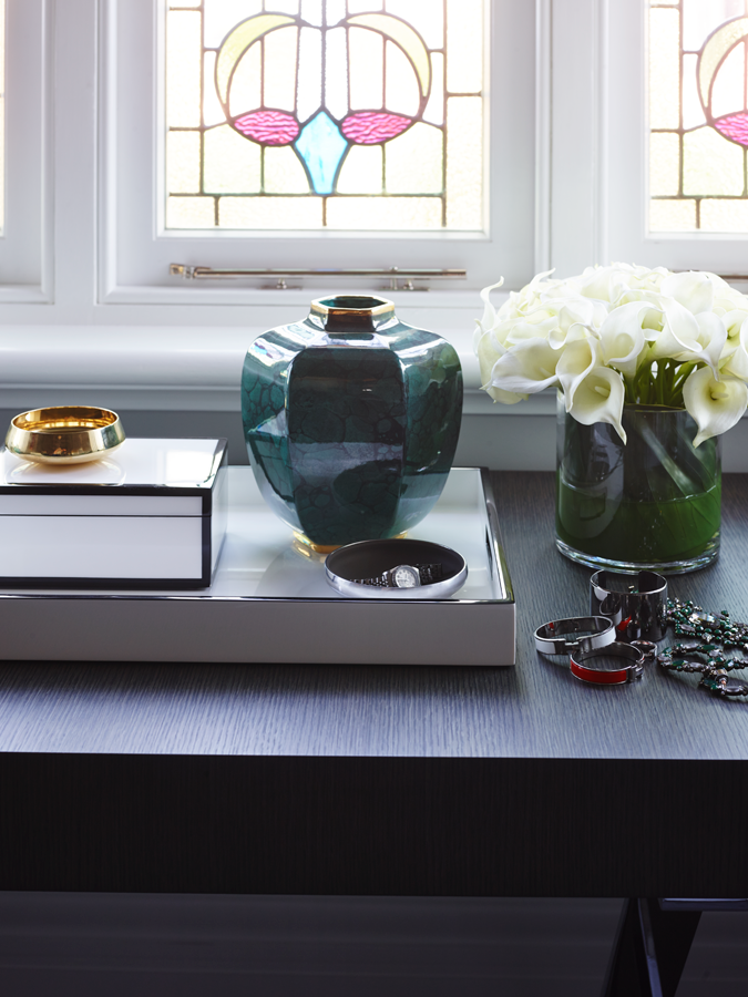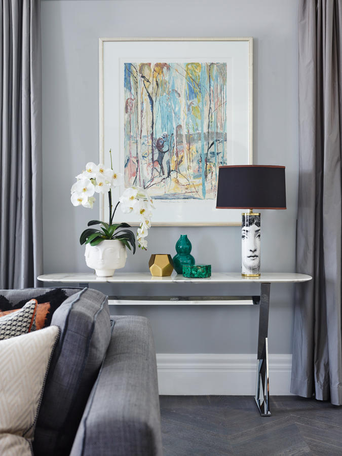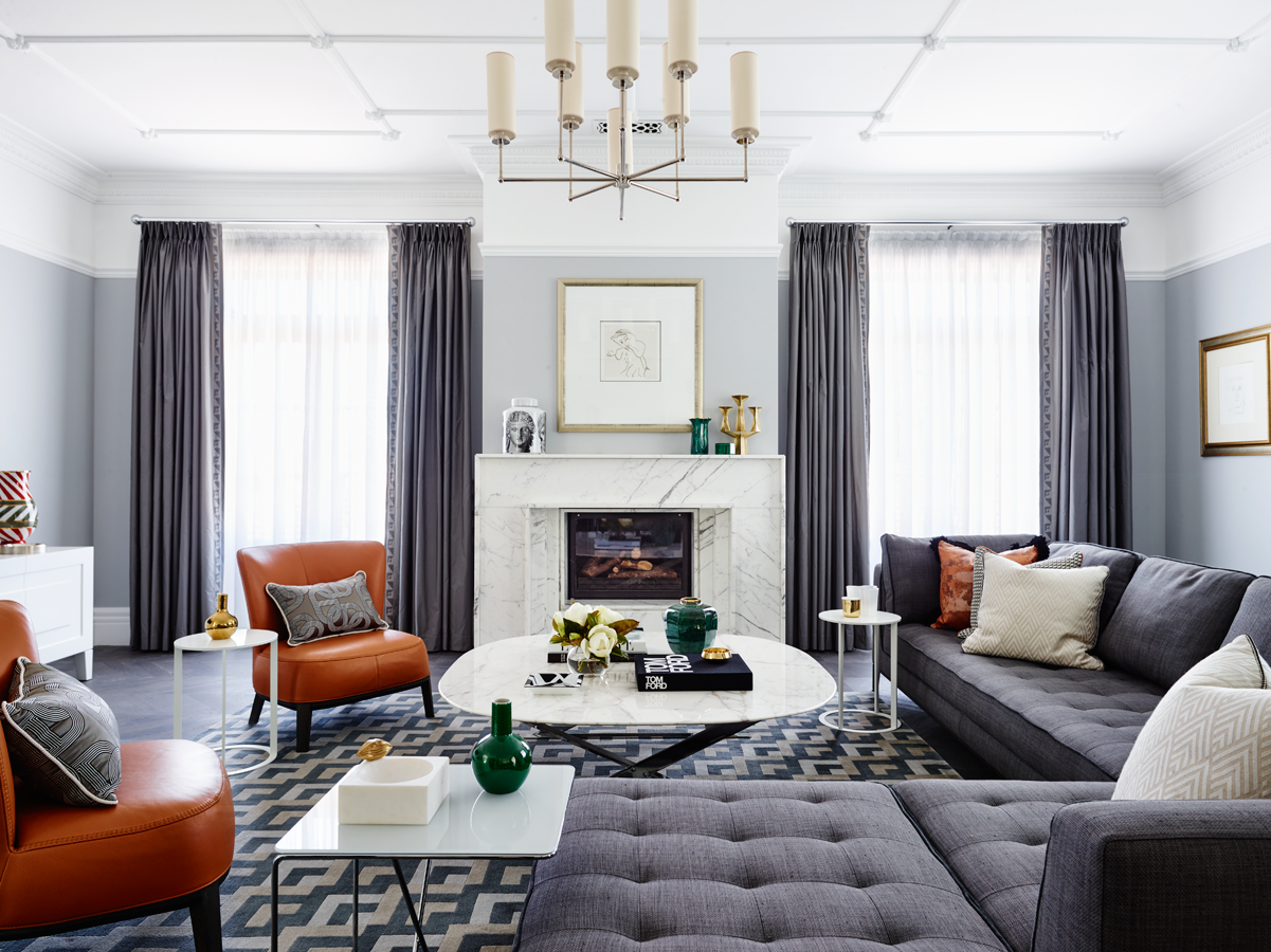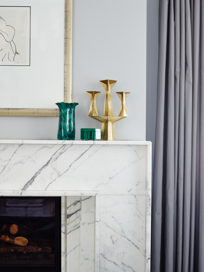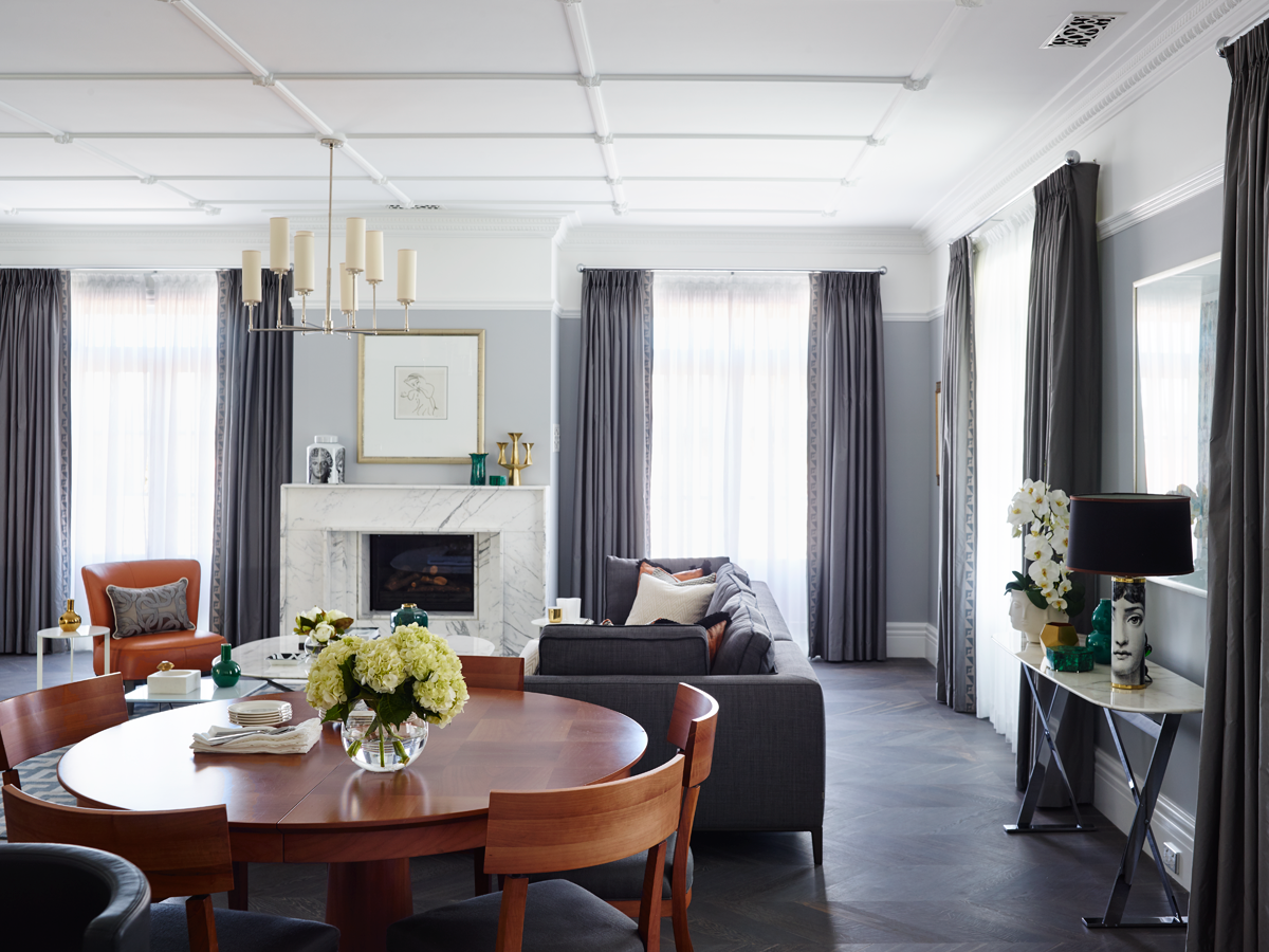The starting point for the home's scheme was the couple's much loved, 20-year-old Italian dining table and chairs. The strength in the tone of the cherrywood inspiring a subdued palette that is balanced with dove greys and pops of malachite green. Tan leather and graphic Greg Natale rugs serve as accent accessories and contribute to the cohesive result.
