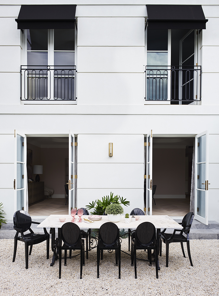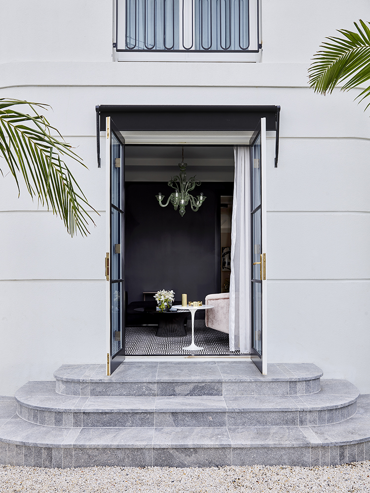 Designed for entertaining, much of the family home opens out to the Myles Baldwin designed gardens and pool. Custom metal work features in the home's grills, balcony rails and gates with Greg Natale tiles welcoming guests in the portico.