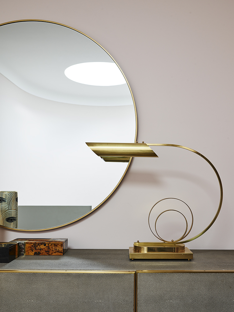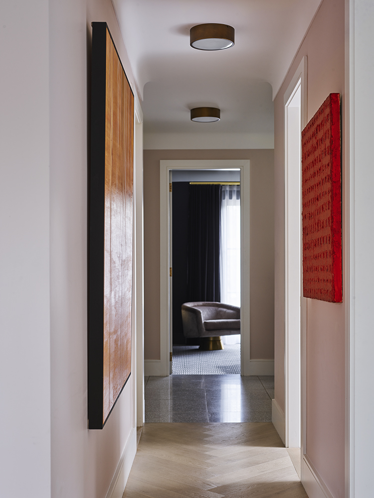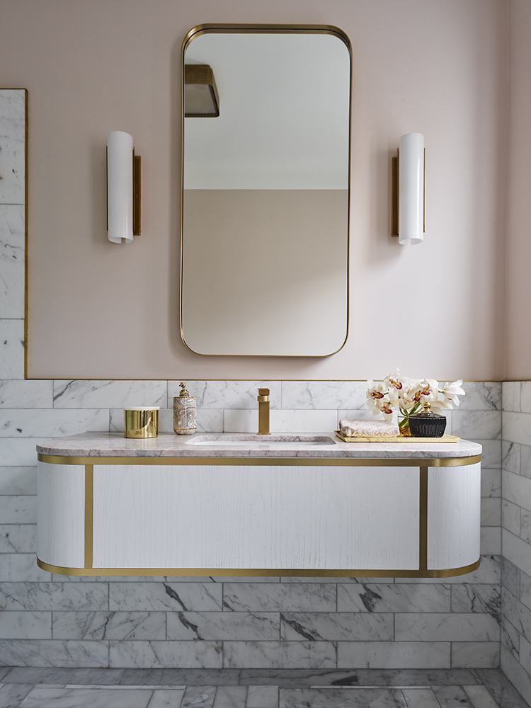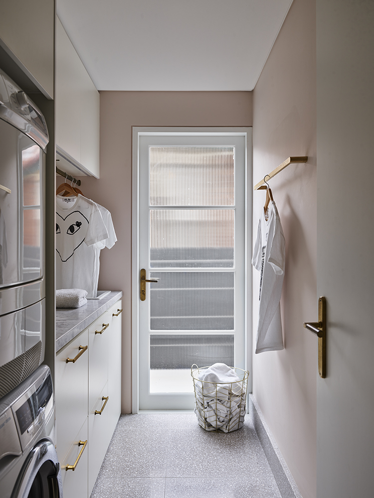 The custom spiral grey terazzo stair features brass inlay with a limited edition piece from sculptor Dan Murphy taking pride of place at the foot of the stair. The master ensuite of the home creates a lasting impression with Greg Natale's Moire pink mosaic tile design for Bisazza gracing the walls.