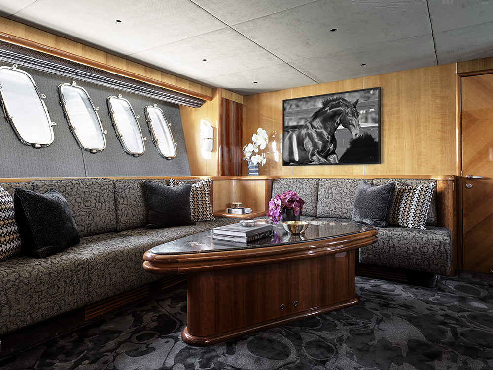 The brief was to elevate the interior experience to rival that of a luxury private jet and to shrug off all predictable nautical allusions. Greg Natale Design stripped the tired yacht right back to the hull - painstakingly restoring the satin cherry wood paneling throughout and introduced custom New Zealand Wool black tufted carpet in Natale’s “Ink” pattern, to tie all interior spaces together.