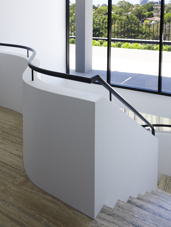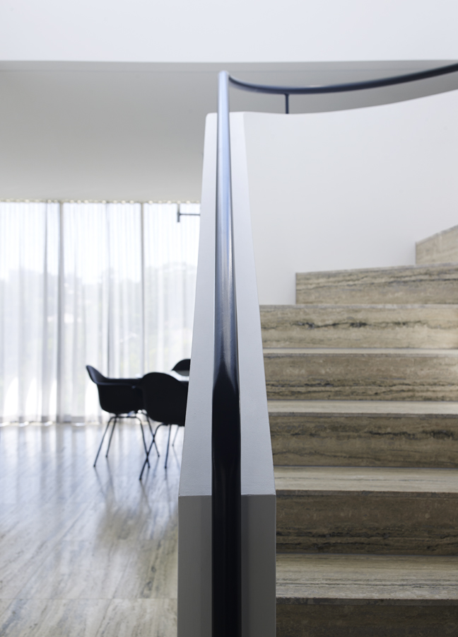 Stone plays a key role in connecting interior and exterior – a wall of concrete blocks on the outside is featured on a wall in the living area, linking the spaces and breaking up the white walls. Finished in the same travertine as the ground floor, a striking ribbon staircase introduces an organic form among the angles.