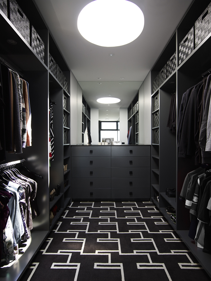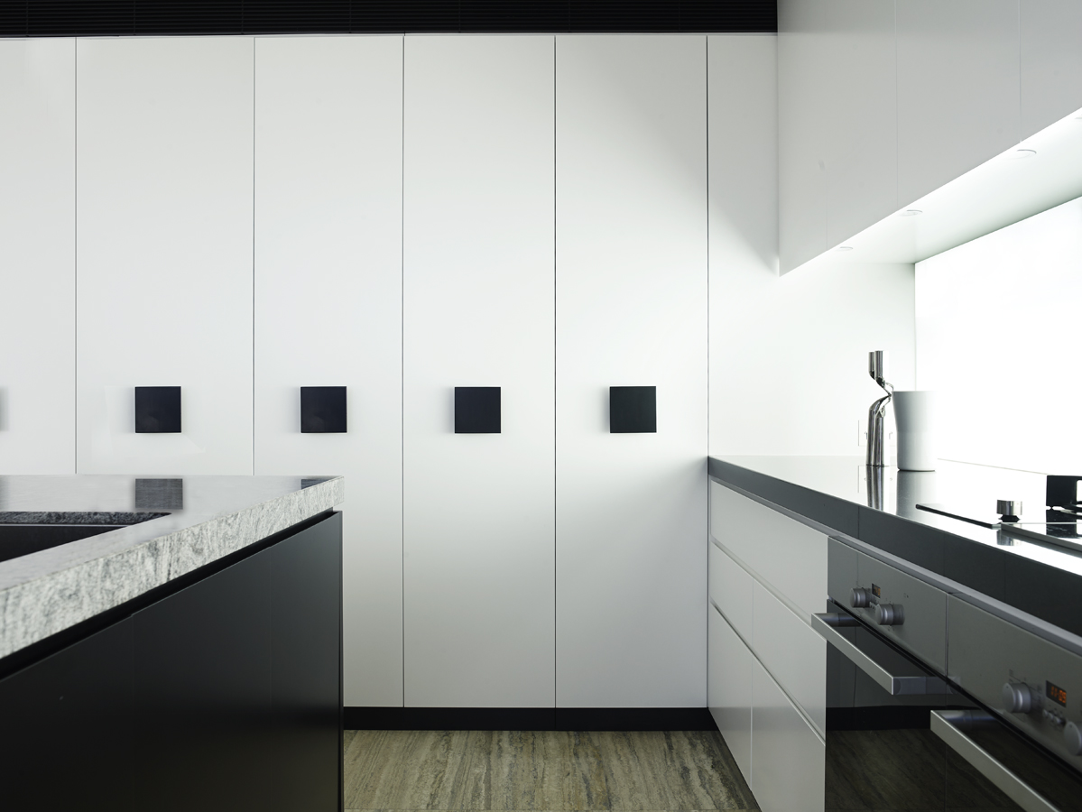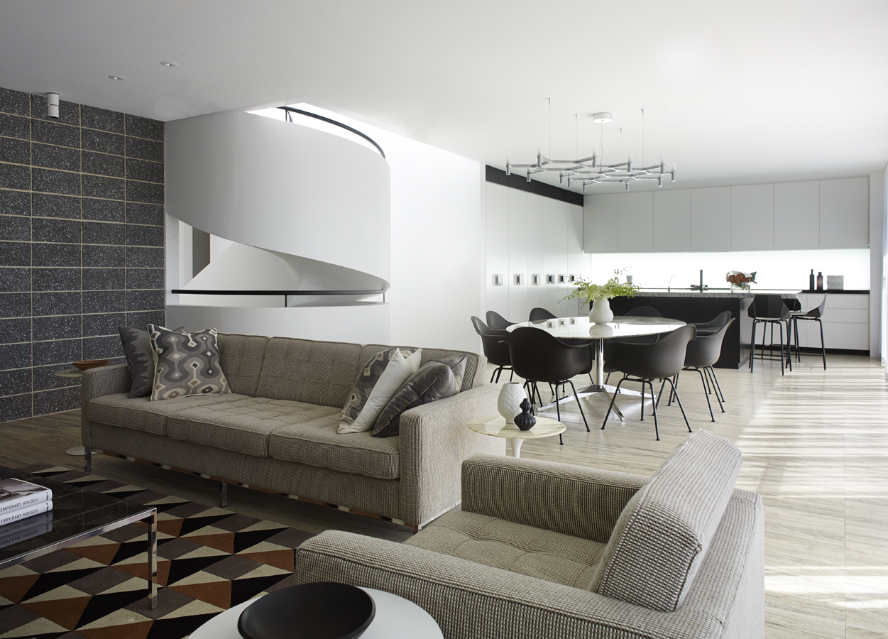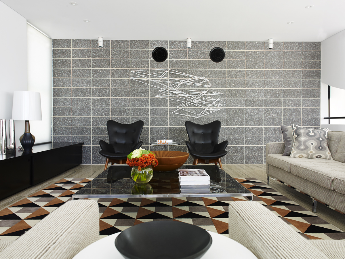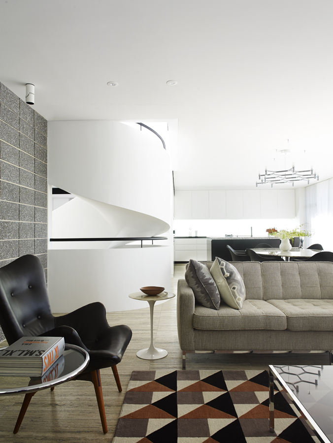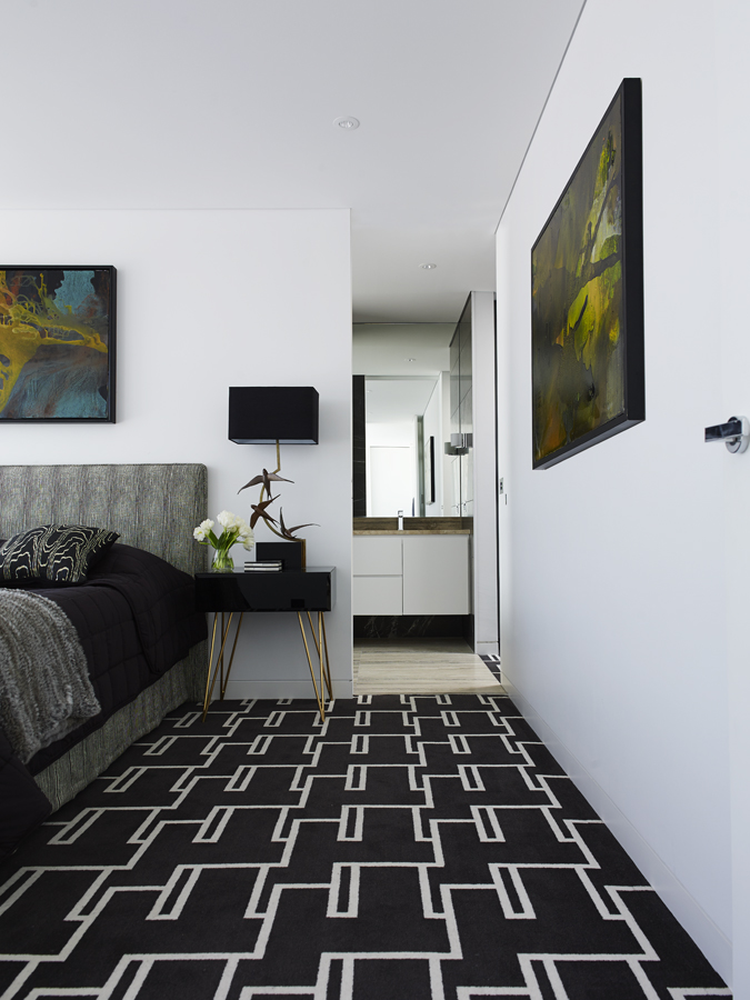 Upstairs, a charcoal and white carpet by Greg Natale for Designer Rugs echoes the house’s monochrome palette at a softer level, tonally and texturally, while the layering of pieces and tones such as tan and smoked glass add warmth.