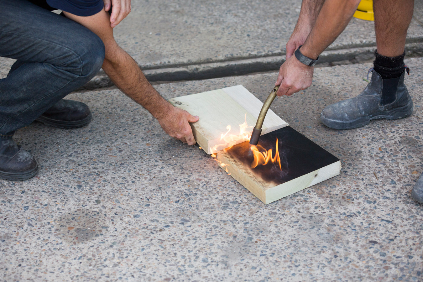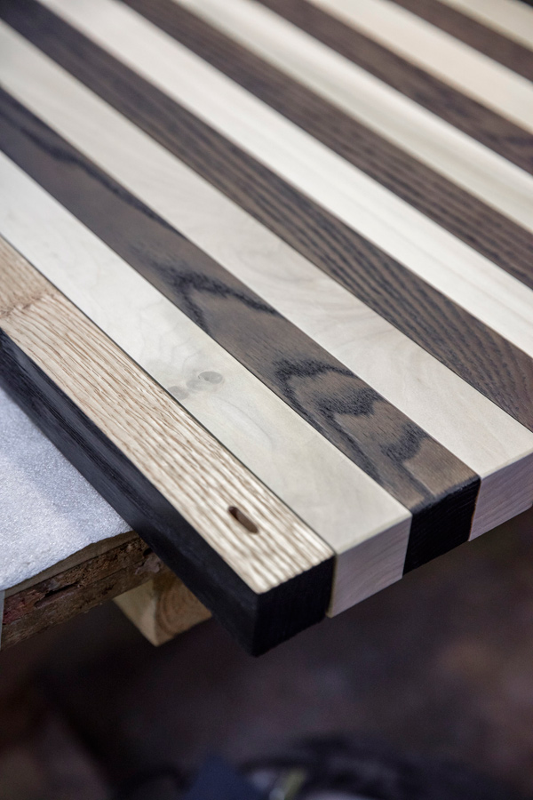 Stripped explores the inherent textural and tactile characteristics of Tulipwood and Red Oak. Employing a wire brushing technique to expose the grain of the Red Oak, the lumber is then charred and blackened through a process of controlled torching. Offering a brilliant contrast the smoothness of the Tulipwood is accentuated with white dust giving the timber a milkiness to touch.