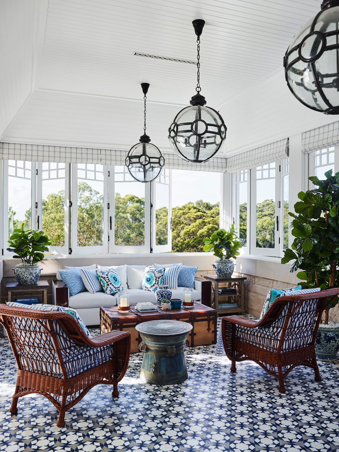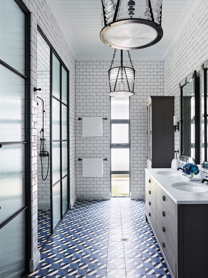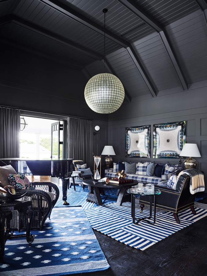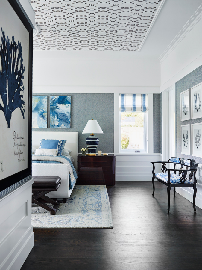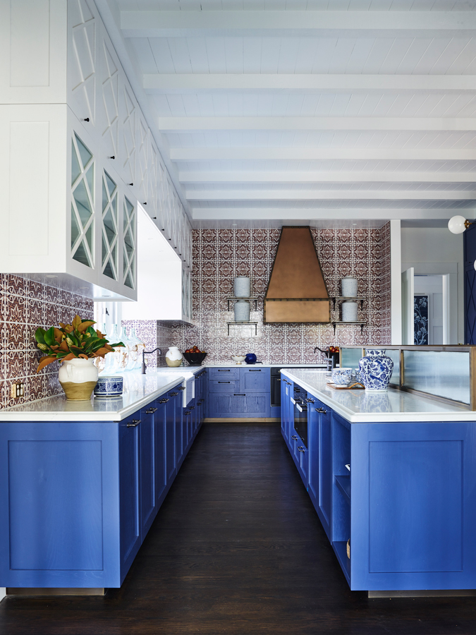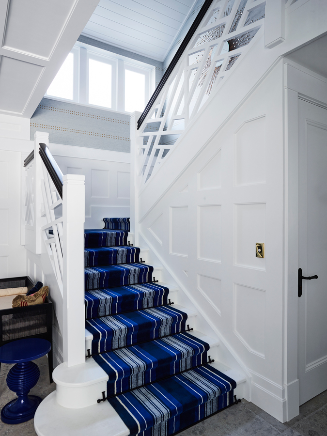 White was an obvious choice to create a light, clean backdrop and highlight the house’s generous proportions, while paneling gives the white ceilings and walls dramatic detail. Blue was the perfect partner to ensure a sophisticated seaside vibe, we opted for a vibrant cobalt, beginning with standout double front doors and continuing in a series of patterned rugs, runners and tiles.