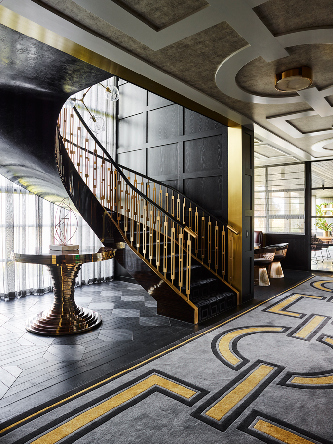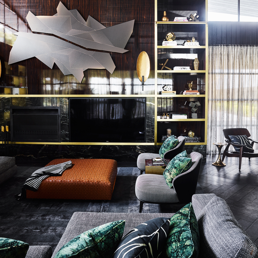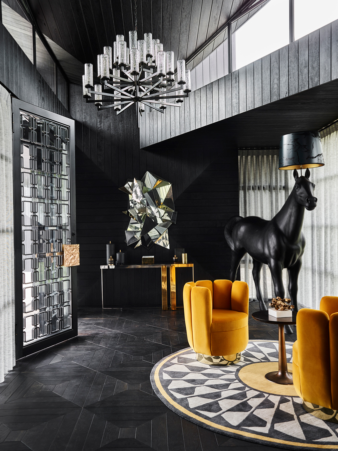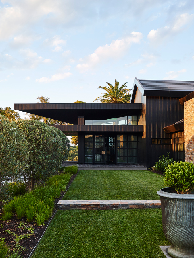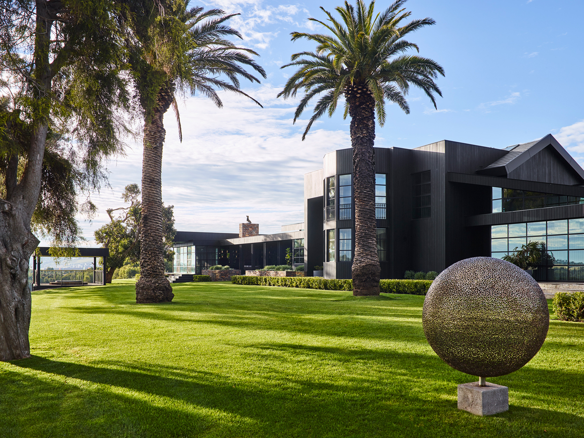 This grand estate in Victoria is a country house like no other. The two-storey, five-bedroom residence is glamorous, luxurious and sexy, a treasure trove of vibrant colours and lavish finishes set against a dramatic backdrop of black-stained timber, ebony and brass.