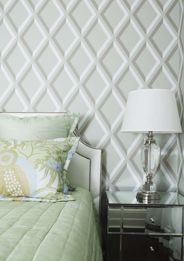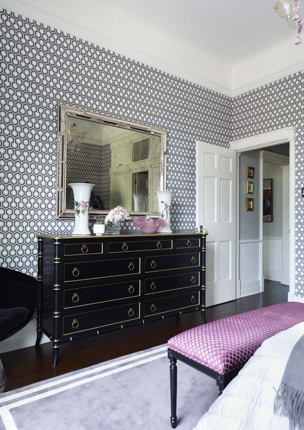 Monochromes anchor the design, providing a strong note against dove-grey walls, with key colours defining different spaces, such as vivid blues in the dining room and green in the hand-painted kitchen. Mid-century ceramics and modern furniture continue to blend old and new, while gilt touches add glamour.