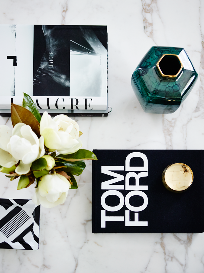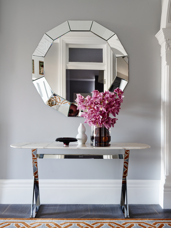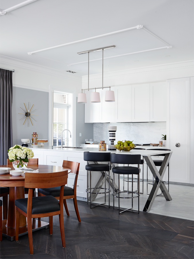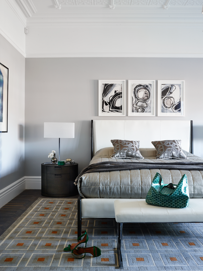 The starting point for the home's scheme was the couple's much loved, 20-year-old Italian dining table and chairs. The strength in the tone of the cherrywood inspiring a subdued palette that is balanced with dove greys and pops of malachite green. Tan leather and graphic Greg Natale rugs serve as accent accessories and contribute to the cohesive result.