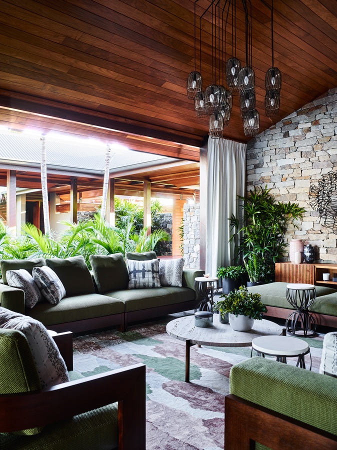 An exceptional vacation home for a young family, one of the features this eight bedroom property shares with tropical Australian resorts is a focus on bringing the outdoors in. The house enjoys exquisite views of the Coral Sea through the native hoop pines, as well as abundant plant life at its doors - as an interior designer establishing a connection to those elements was central to the concept.