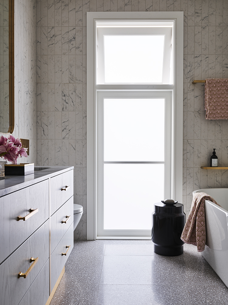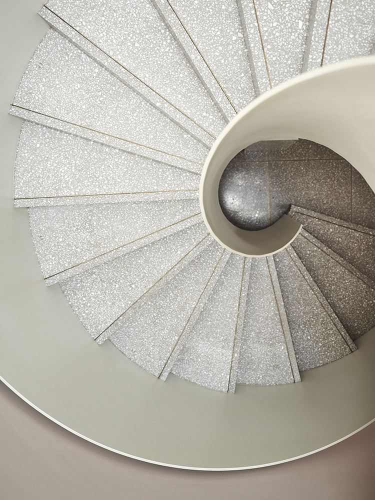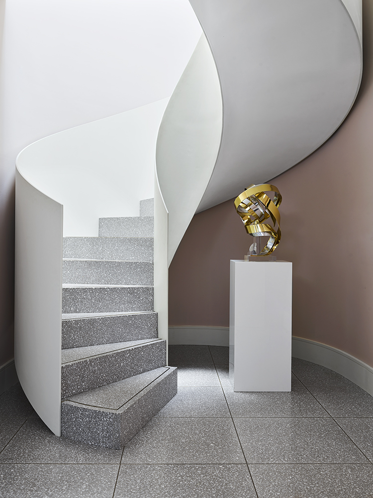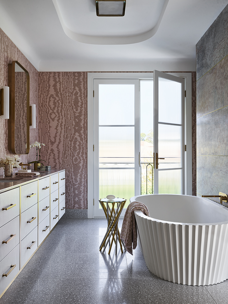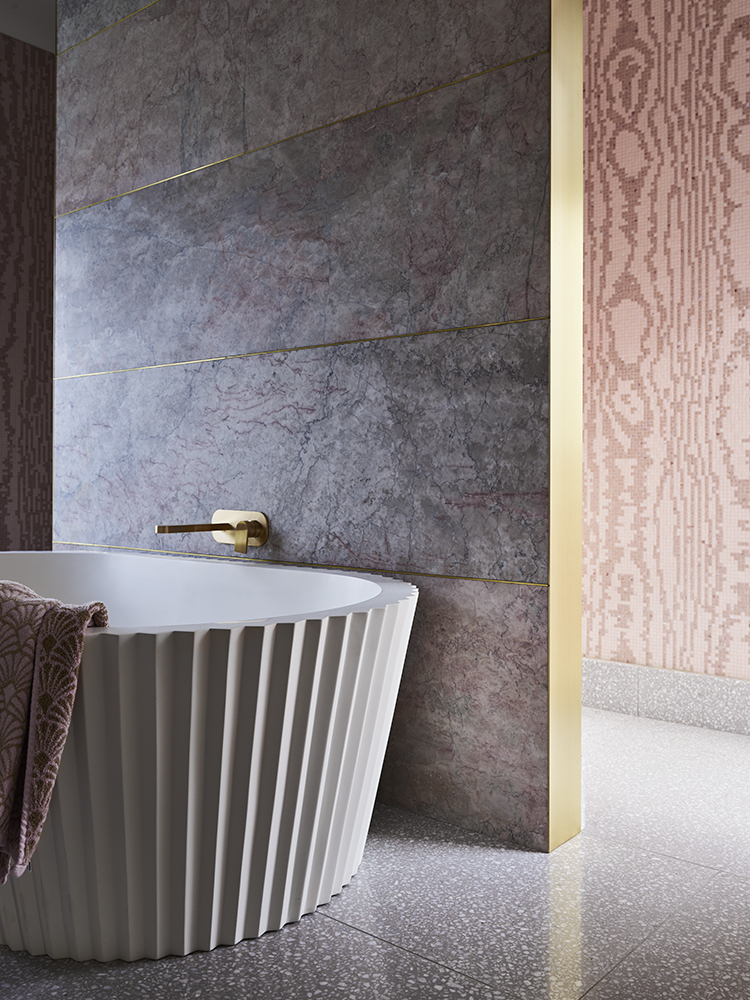 The custom spiral grey terazzo stair features brass inlay with a limited edition piece from sculptor Dan Murphy taking pride of place at the foot of the stair.  The master ensuite of the home creates a lasting impression with Greg Natale's Moire pink mosaic tile design for Bisazza gracing the walls.