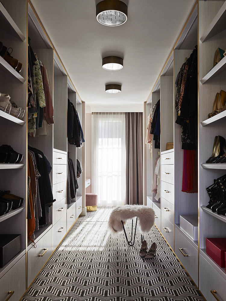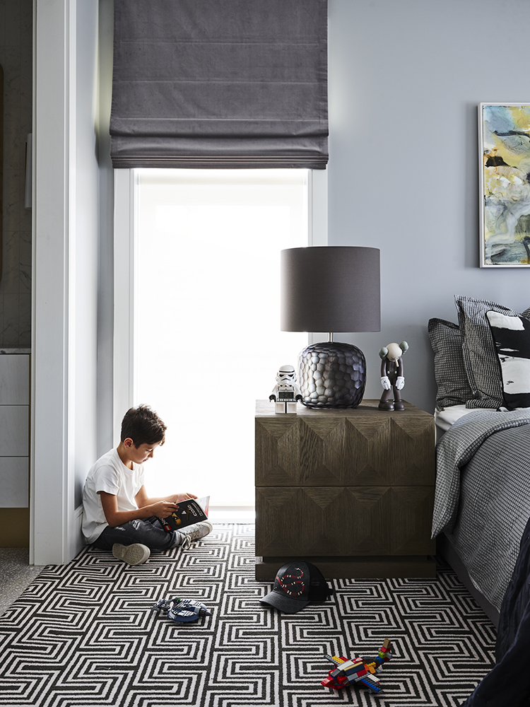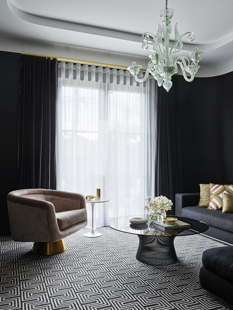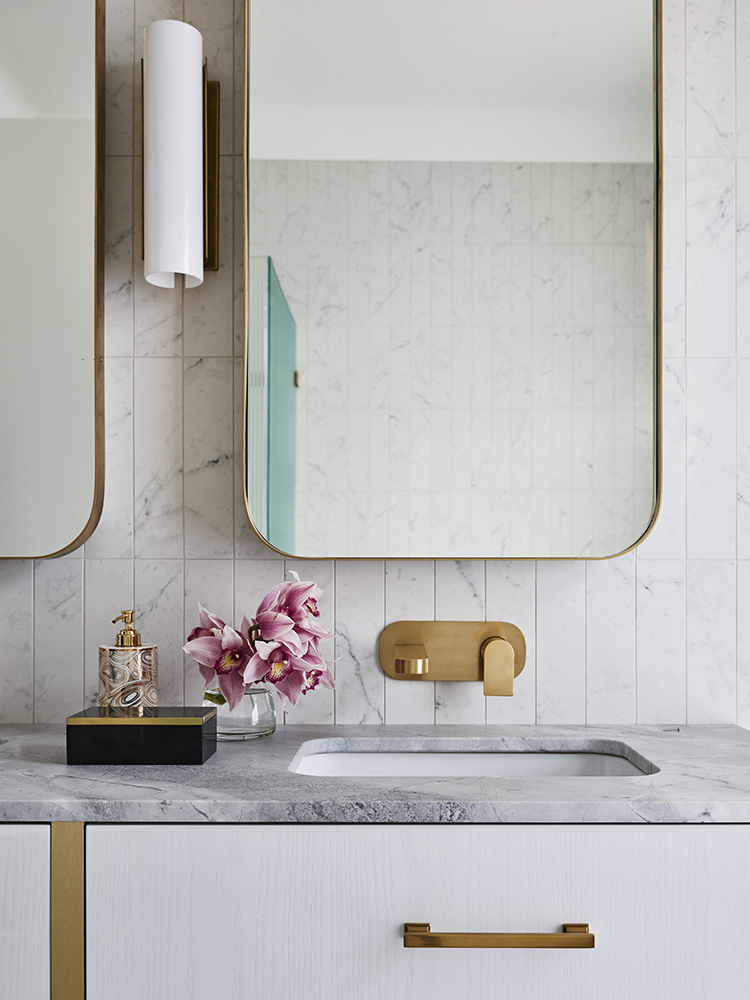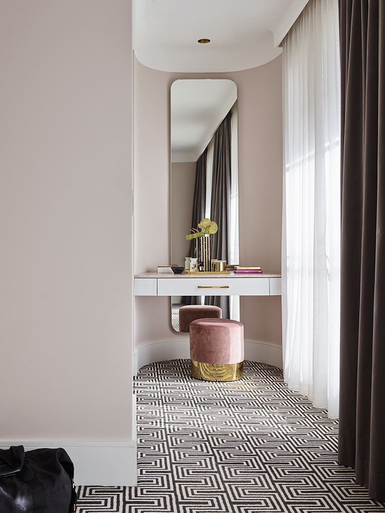 The custom spiral grey terazzo stair features brass inlay with a limited edition piece from sculptor Dan Murphy taking pride of place at the foot of the stair.  The master ensuite of the home creates a lasting impression with Greg Natale's Moire pink mosaic tile design for Bisazza gracing the walls.