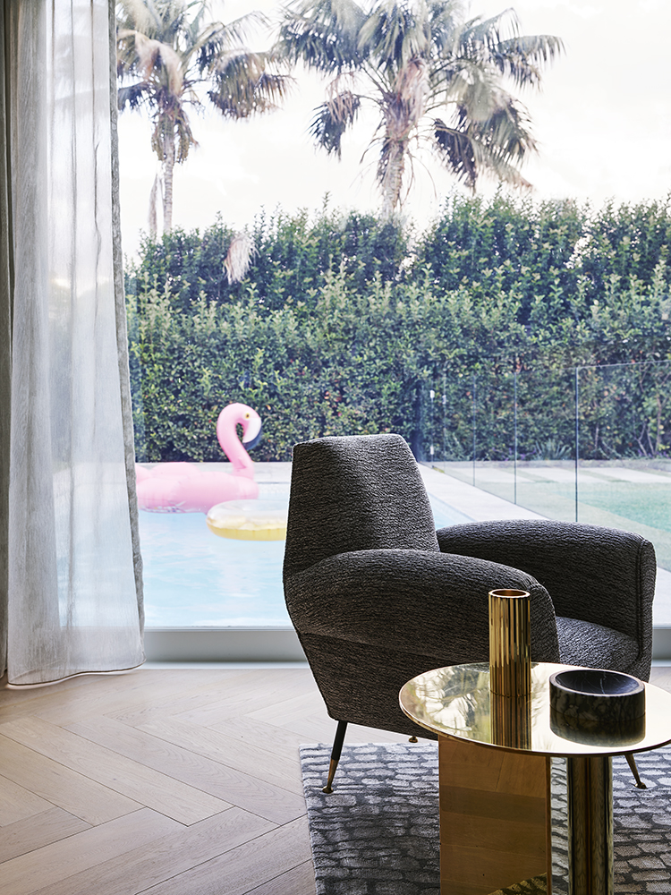 Designed for entertaining, much of the family home opens out to the Myles Baldwin designed gardens and pool. Custom metal work features in the home's grills, balcony rails and gates with Greg Natale tiles welcoming guests in the portico.