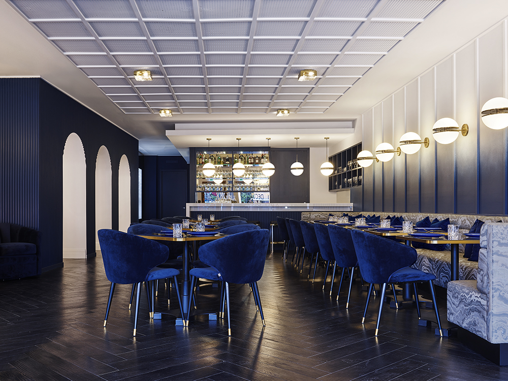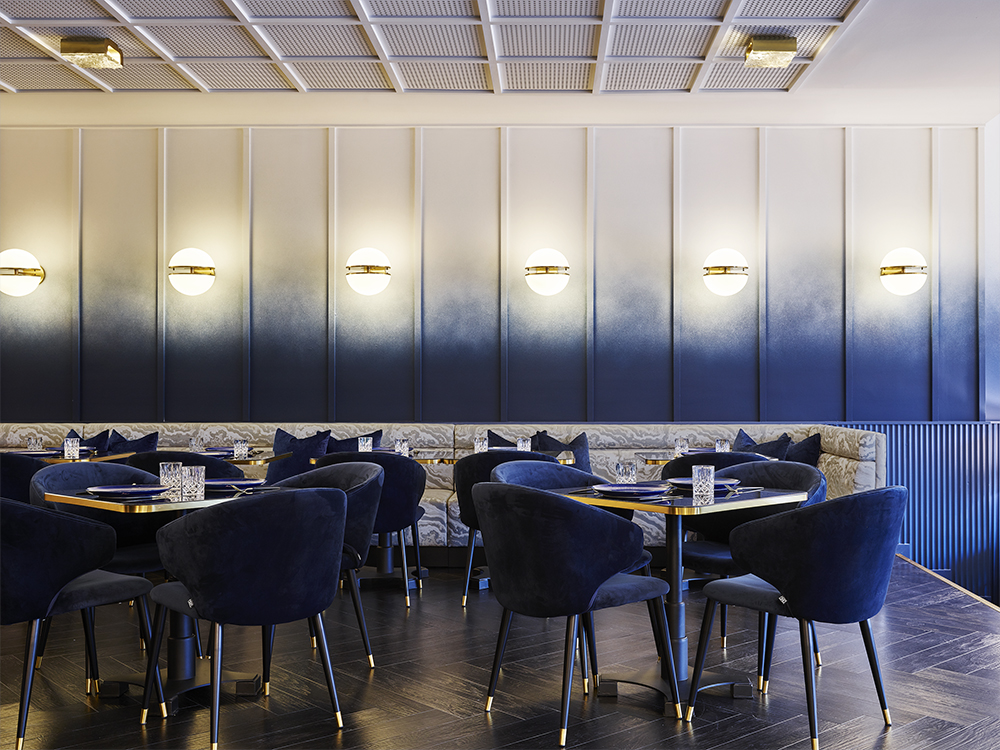 The custom painted ombre walls are a signature of the space graduating from the black stain timber floors through to the white ceiling overhead. The richness of the blue paint is carried through the upholstered furnishings as well as the fluted wall treatments that separate the arched private dining room from the bar area.