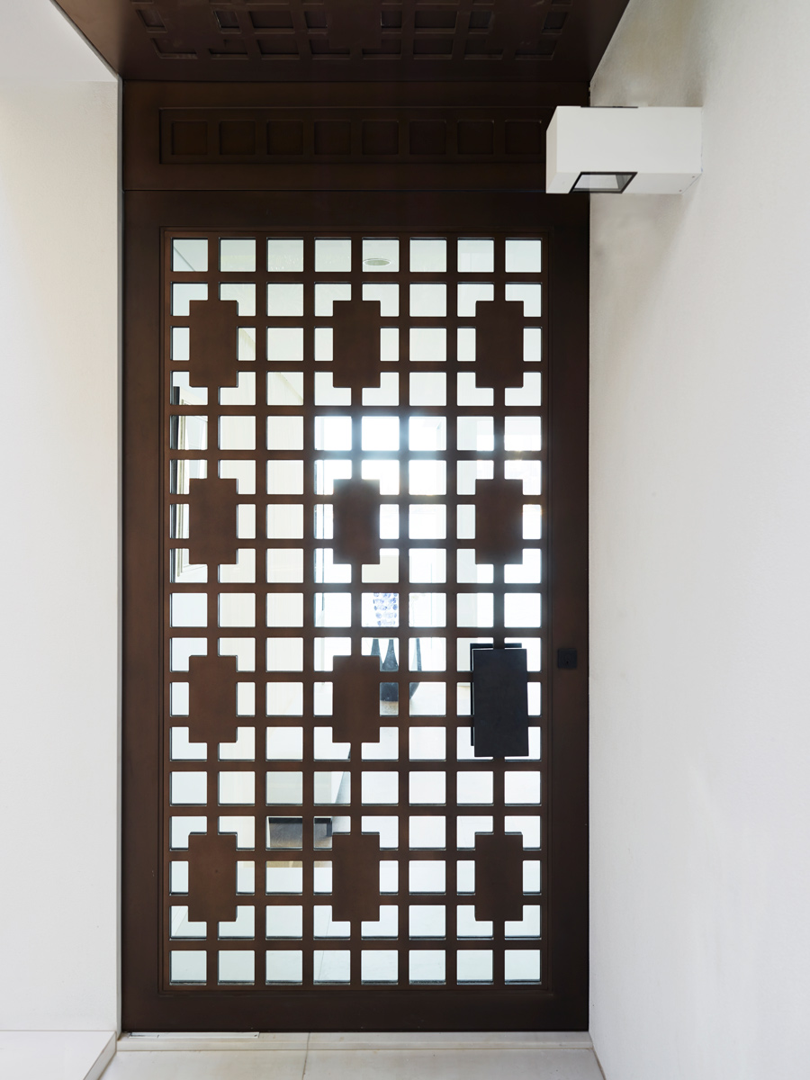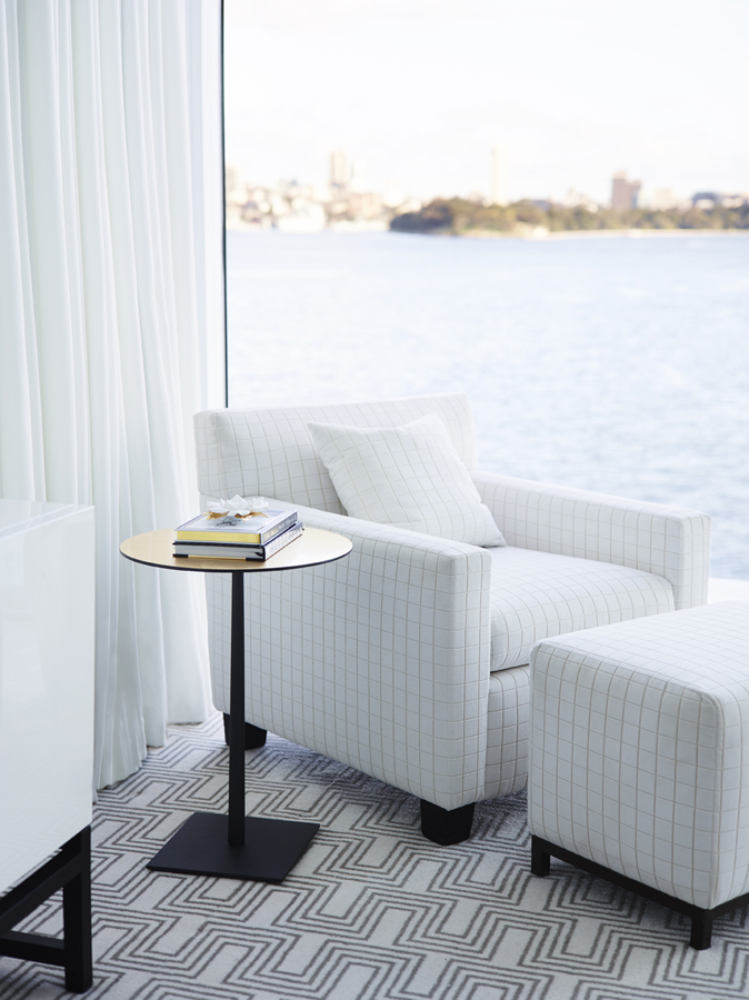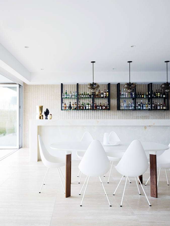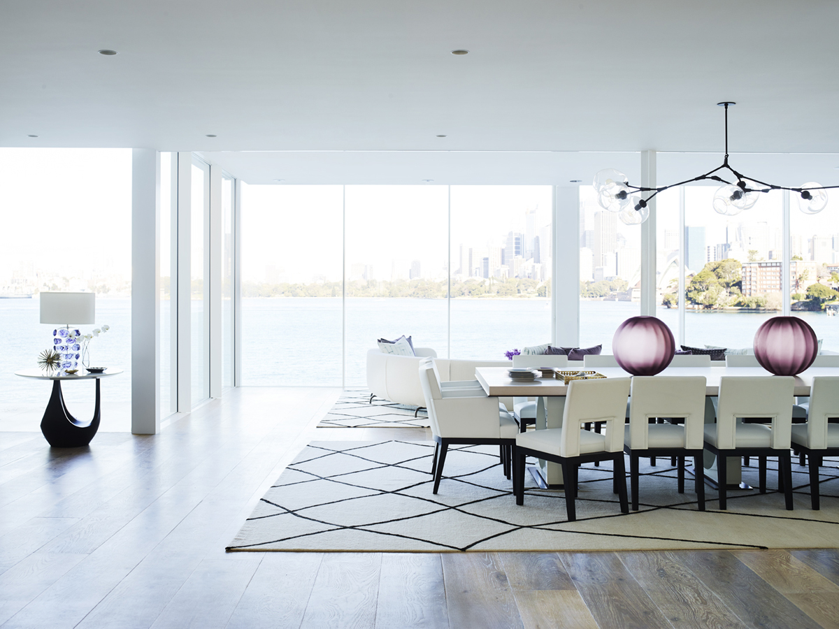 Angles and organics bring balance to the design, while narrow black lines appear throughout, in chair and table legs, mirror frames, a rug, lamp bases and light fittings, acting like elegant frames that highlight the house’s incredible view.