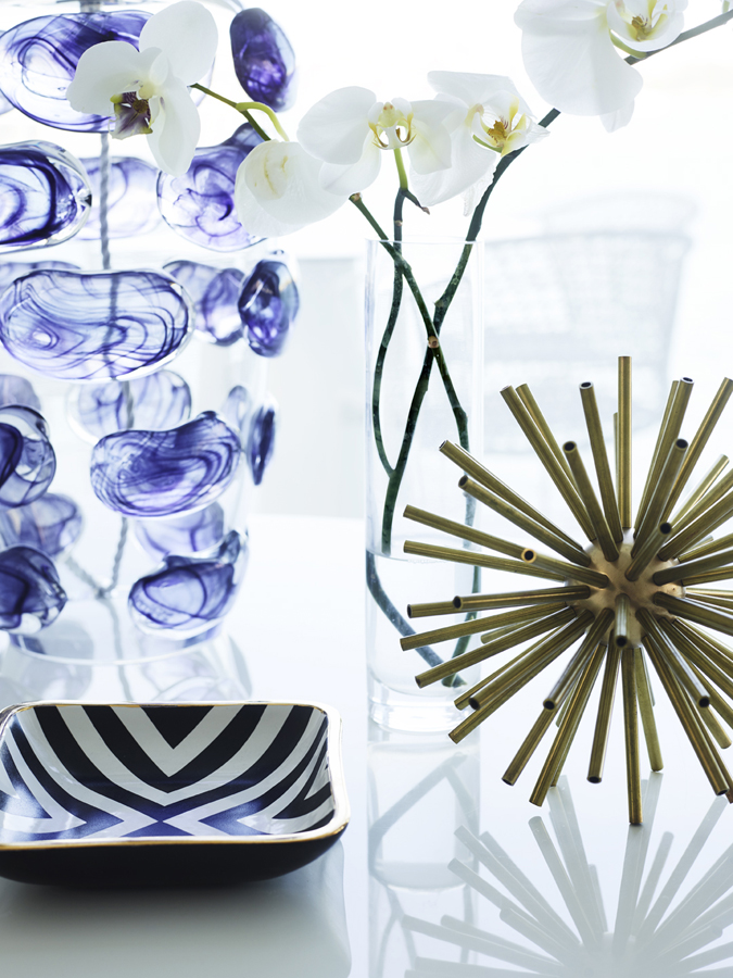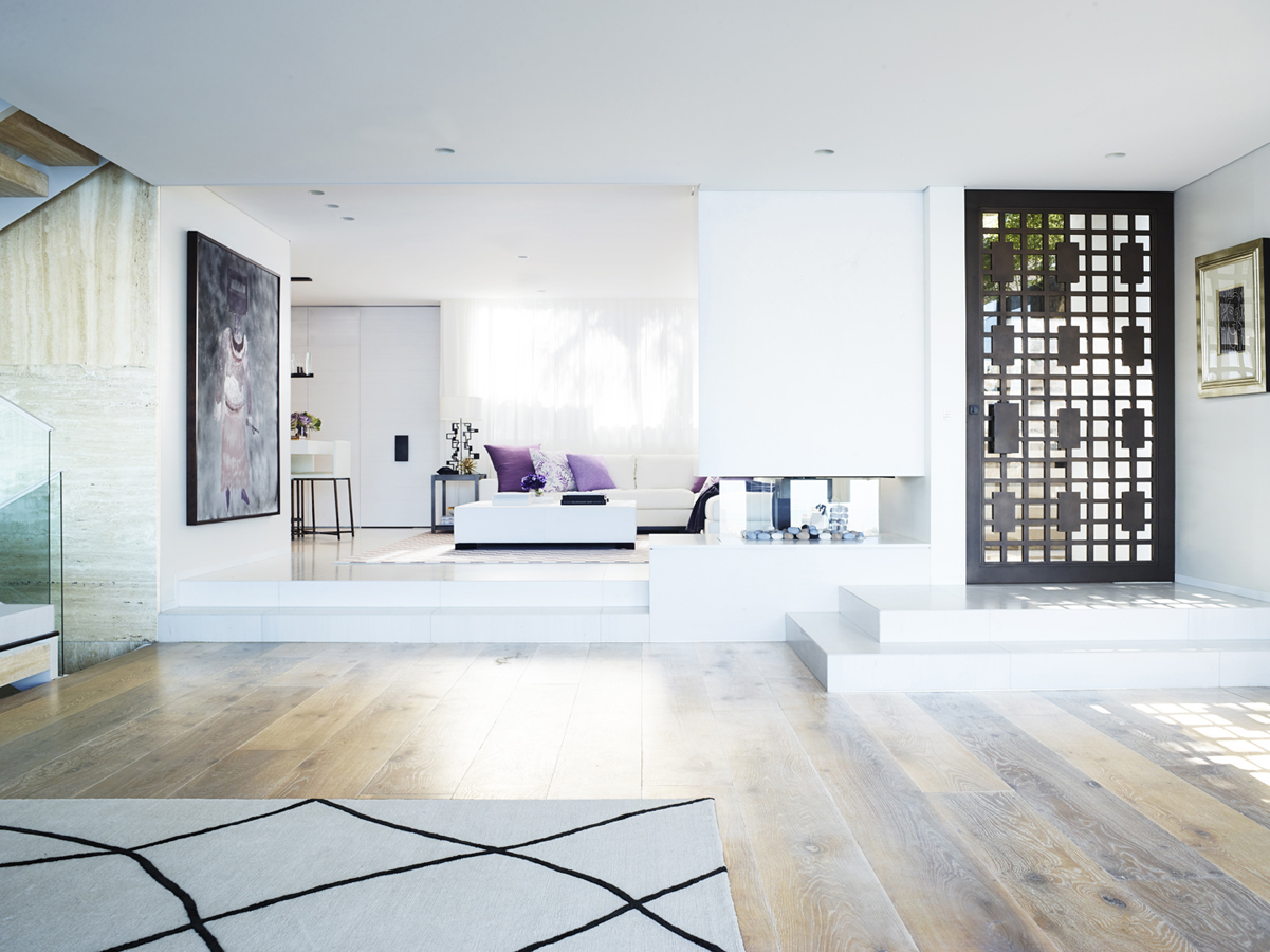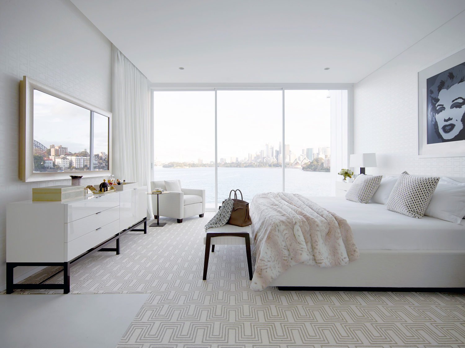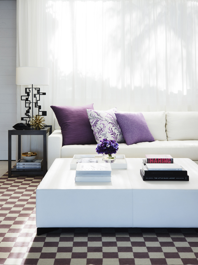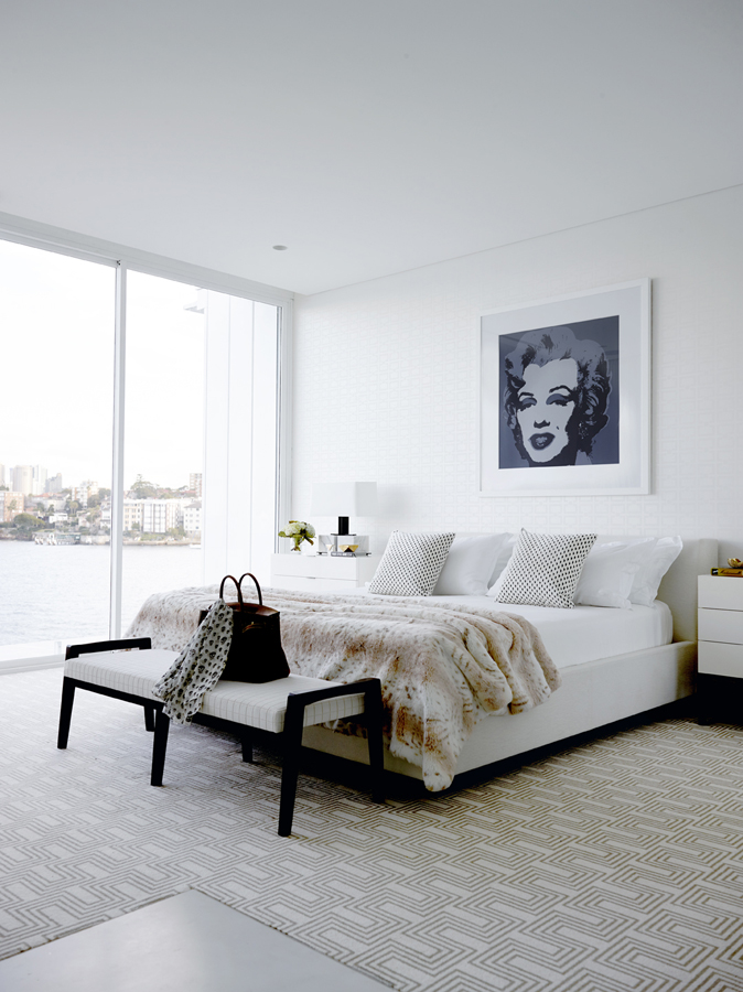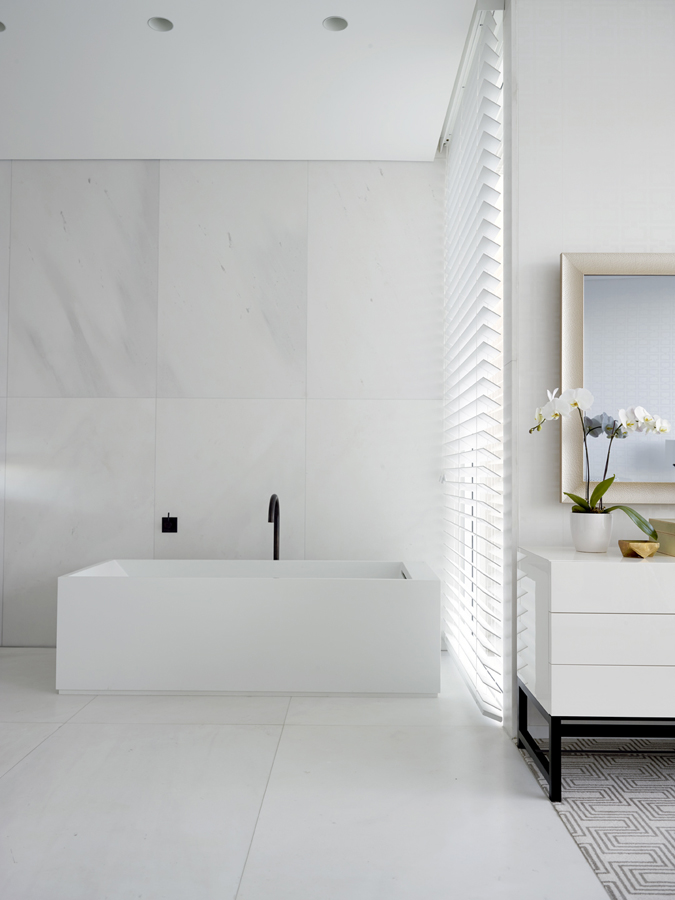 The white palette reflects and emphasises this, with different finishes adding detail – the panelling in kitchen cabinetry, the pattern of marble in a bathroom, a subtle geometric bedroom wallpaper, a patterned armchair. Against that, pops of indigo, plum and violet add intensity.