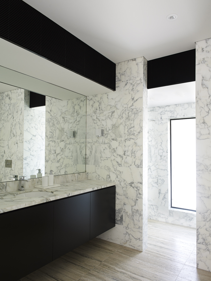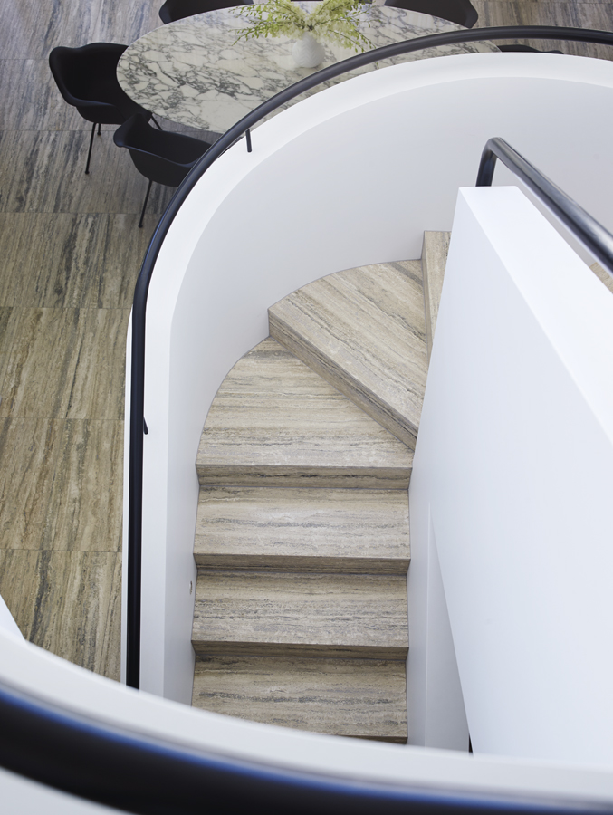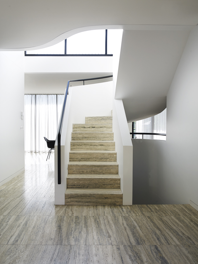 Stone plays a key role in connecting interior and exterior – a wall of concrete blocks on the outside is featured on a wall in the living area, linking the spaces and breaking up the white walls. Finished in the same travertine as the ground floor, a striking ribbon staircase introduces an organic form among the angles.