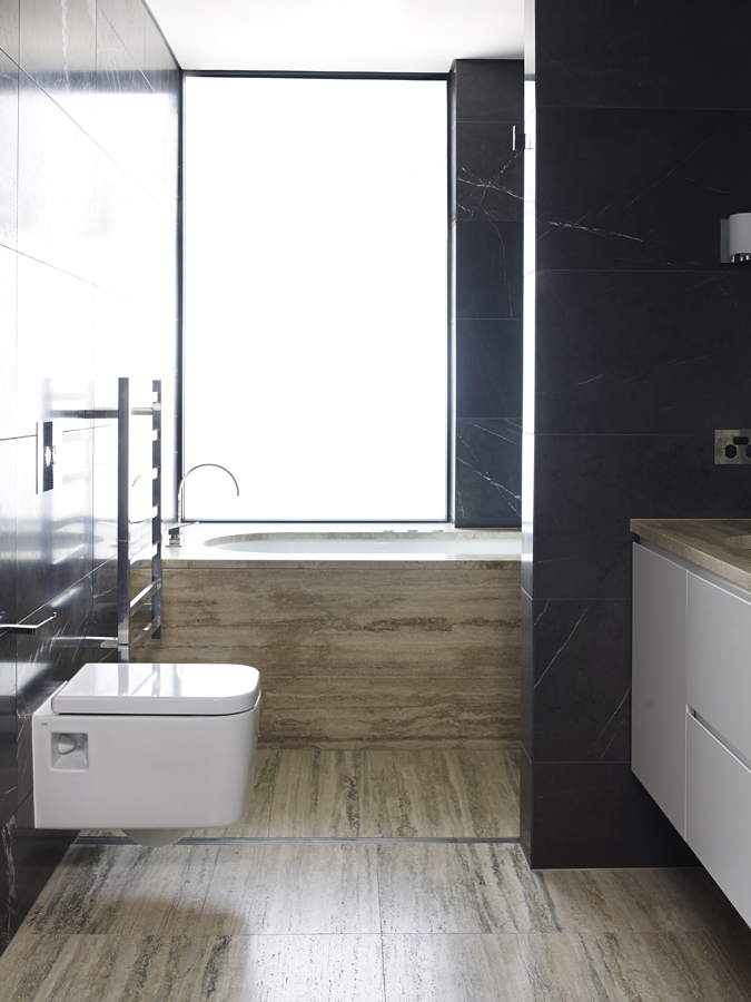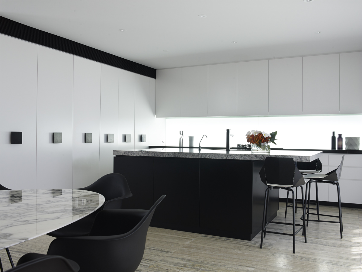 Upstairs, a charcoal and white carpet by Greg Natale for Designer Rugs echoes the house’s monochrome palette at a softer level, tonally and texturally, while the layering of pieces and tones such as tan and smoked glass add warmth.
